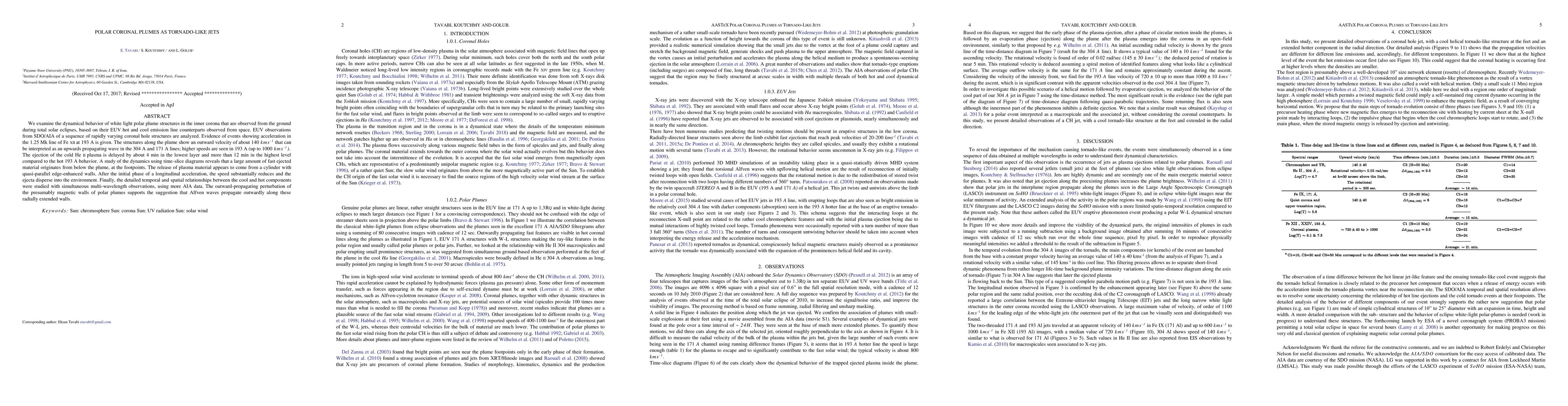 This paper investigates the dynamics of polar coronal plumes, comparing ground-based white light observations with space-based EUV data from SDO/AIA. It finds rapid acceleration and high speeds in Fe XII lines, suggesting Alfven wave propagation along the plume's magnetic walls, with significant material ejection from below the plume's footpoints.