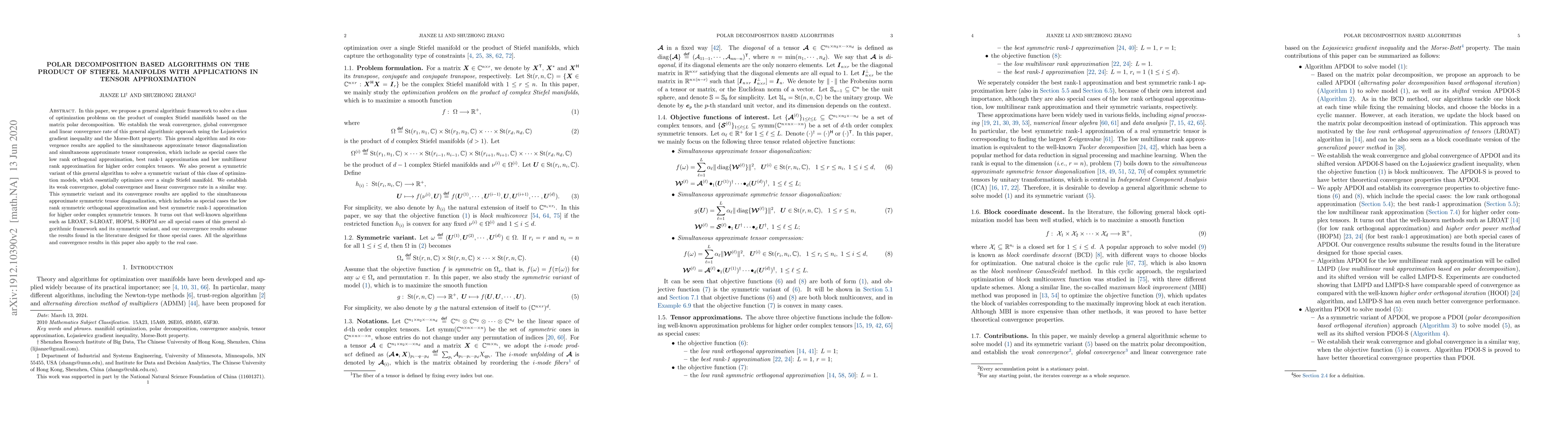 In this paper, we propose a general algorithmic framework to solve a class of optimization problems on the product of complex Stiefel manifolds based on the matrix polar decomposition. We establish the weak convergence, global convergence and linear convergence rate of this general algorithmic approach using the \L{}ojasiewicz gradient inequality and the Morse-Bott property. This general algorithm and its convergence results are applied to the simultaneous approximate tensor diagonalization and simultaneous approximate tensor compression, which include as special cases the low rank orthogonal approximation, best rank-1 approximation and low multilinear rank approximation for higher order complex tensors. We also present a symmetric variant of this general algorithm to solve a symmetric variant of this class of optimization models, which essentially optimizes over a single Stiefel manifold. We establish its weak convergence, global convergence and linear convergence rate in a similar way. This symmetric variant and its convergence results are applied to the simultaneous approximate symmetric tensor diagonalization, which includes as special cases the low rank symmetric orthogonal approximation and best symmetric rank-1 approximation for higher order complex symmetric tensors. It turns out that well-known algorithms such as LROAT, S-LROAT, HOPM, S-HOPM are all special cases of this general algorithmic framework and its symmetric variant, and our convergence results subsume the results found in the literature designed for those special cases. All the algorithms and convergence results in this paper also apply to the real case.