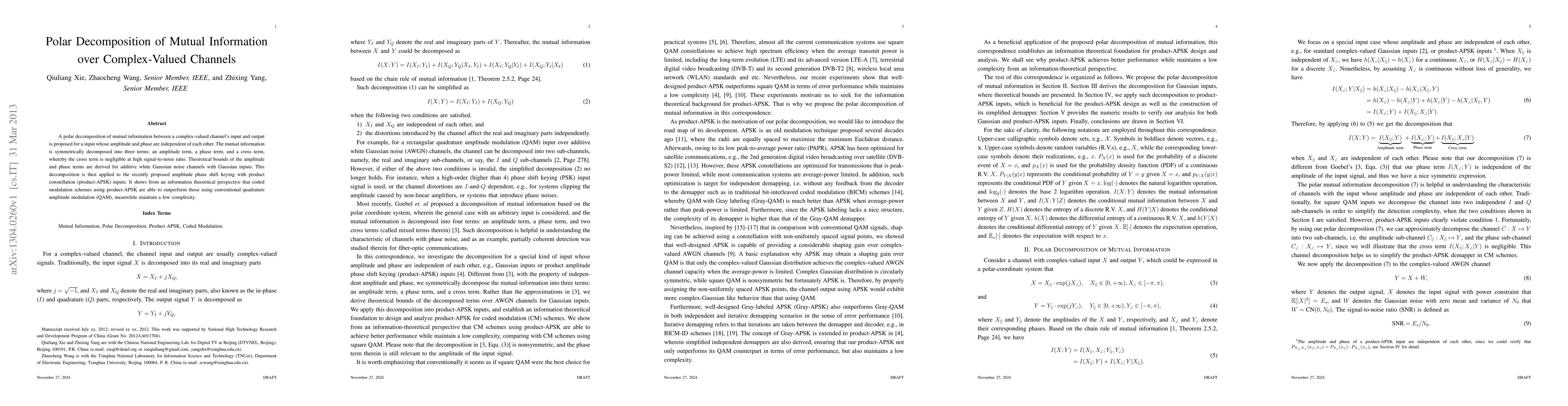 This paper proposes a polar decomposition of mutual information for complex-valued channels, separating it into amplitude, phase, and negligible cross terms. Theoretical bounds for the amplitude and phase terms are derived for Gaussian inputs over additive white Gaussian noise channels, demonstrating that coded modulation schemes using product-APSK outperform conventional QAM while maintaining low complexity.