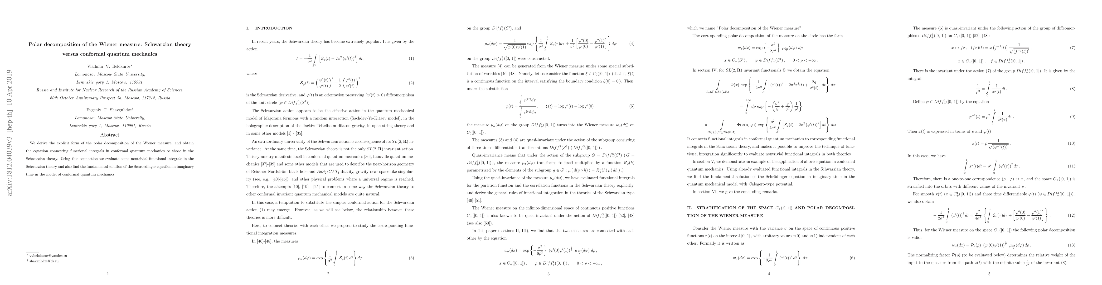 This paper derives the polar decomposition of the Wiener measure and establishes a link between functional integrals in conformal quantum mechanics and Schwarzian theory. It evaluates certain nontrivial functional integrals in Schwarzian theory and finds the fundamental solution of the Schrödinger equation in imaginary time for conformal quantum mechanics.