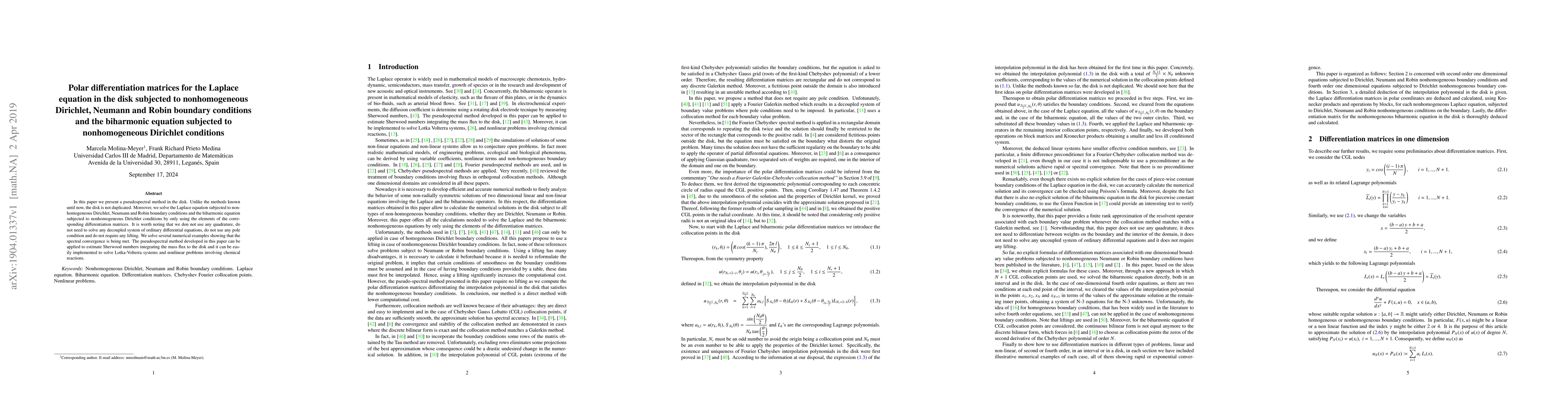 In this paper we present a pseudospectral method in the disk. Unlike the methods known until now, the disk is not duplicated. Moreover, we solve the Laplace equation subjected to nonhomogeneous Dirichlet, Neumann and Robin boundary conditions and the biharmonic equation subjected to nonhomogeneous Dirichlet conditions by only using the elements of the corresponding differentiation matrices. It is worth noting that we don not use any quadrature, do not need to solve any decoupled system of ordinary differential equations, do not use any pole condition and do not require any lifting. We solve several numerical examples showing that the spectral convergence is being met. The pseudospectral method developed in this paper can be applied to estimate Sherwood numbers integrating the mass flux to the disk and it can be easily implemented to solve Lotka-Volterra systems and nonlinear problems involving chemical reactions.