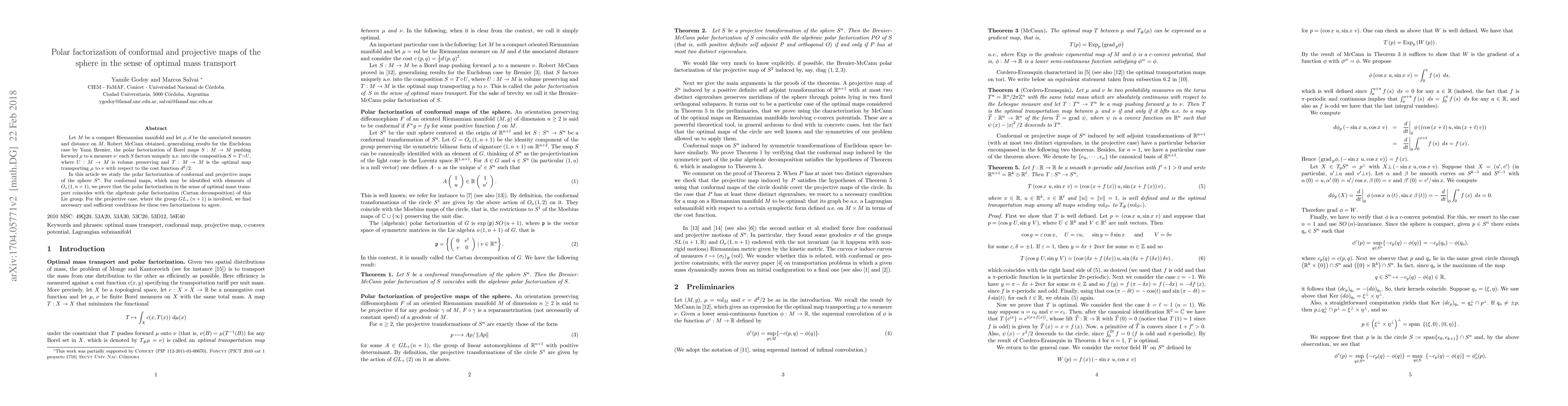 Let M be a compact Riemannian manifold and let $\mu$,d be the associated measure and distance on M. Robert McCann obtained, generalizing results for the Euclidean case by Yann Brenier, the polar factorization of Borel maps S : M -> M pushing forward $\mu$ to a measure $\nu$: each S factors uniquely a.e. into the composition S = T \circ U, where U : M -> M is volume preserving and T : M -> M is the optimal map transporting $\mu$ to $\nu$ with respect to the cost function d^2/2. In this article we study the polar factorization of conformal and projective maps of the sphere S^n. For conformal maps, which may be identified with elements of the identity component of O(1,n+1), we prove that the polar factorization in the sense of optimal mass transport coincides with the algebraic polar factorization (Cartan decomposition) of this Lie group. For the projective case, where the group GL_+(n+1) is involved, we find necessary and sufficient conditions for these two factorizations to agree.