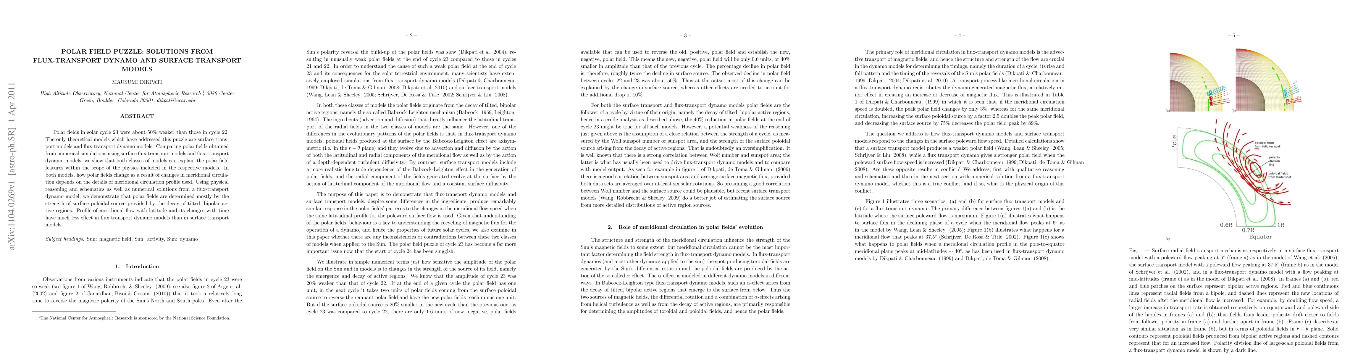 This paper compares polar field models from flux-transport dynamo and surface transport models, showing both can explain the weaker polar fields in solar cycle 23. The study finds that the strength of surface poloidal sources, rather than meridional circulation profiles, primarily determines the polar fields.