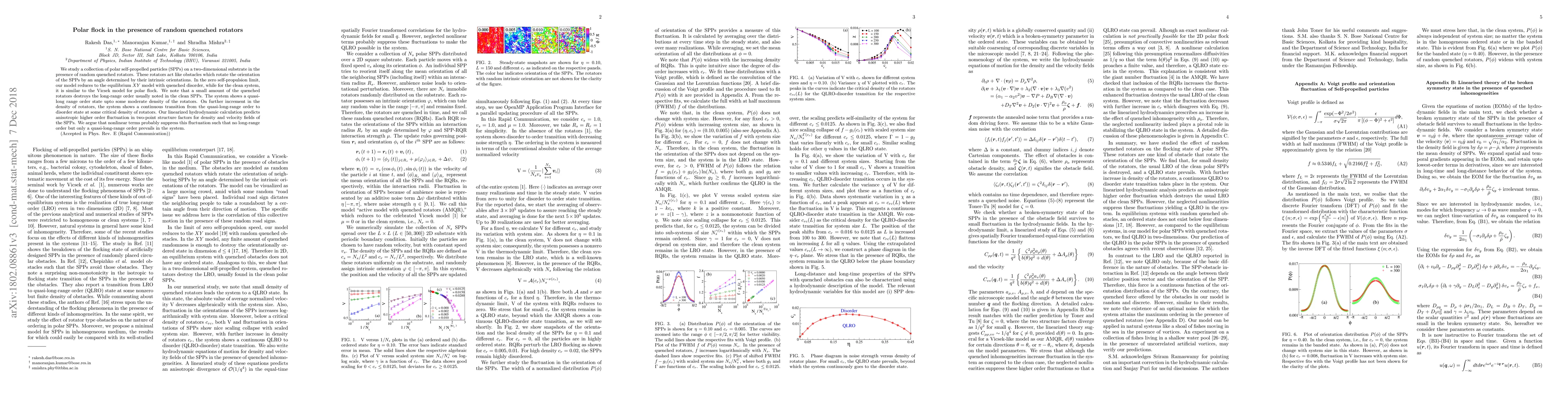 We study a collection of polar self-propelled particles (SPPs) on a two-dimensional substrate in the presence of random quenched rotators. These rotators act like obstacles which rotate the orientation of the SPPs by an angle determined by their intrinsic orientations. In the zero self-propulsion limit, our model reduces to the equilibrium $XY$ model with quenched disorder, while for the clean system, it is similar to the Vicsek model for polar flock. We note that a small amount of the quenched rotators destroys the long-range order usually noted in the clean SPPs. The system shows a quasi-long range order state upto some moderate density of the rotators. On further increment in the density of rotators, the system shows a continuous transition from the quasi-long-range order to disorder state at some critical density of rotators. Our linearized hydrodynamic calculation predicts anisotropic higher order fluctuation in two-point structure factors for density and velocity fields of the SPPs. We argue that nonlinear terms probably suppress this fluctuation such that no long-range order but only a quasi-long-range order prevails in the system.
