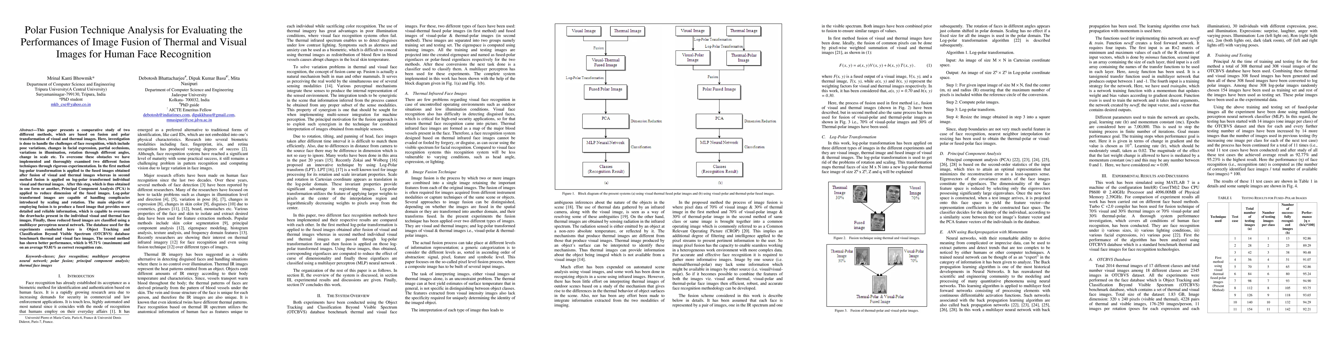 This paper compares two fusion techniques for enhancing human face recognition using thermal and visual images, focusing on challenges like pose variations and illumination changes. The second method, which fuses log-polar transformed images followed by PCA, achieves a maximum recognition rate of 95.71% and an average of 93.81%.