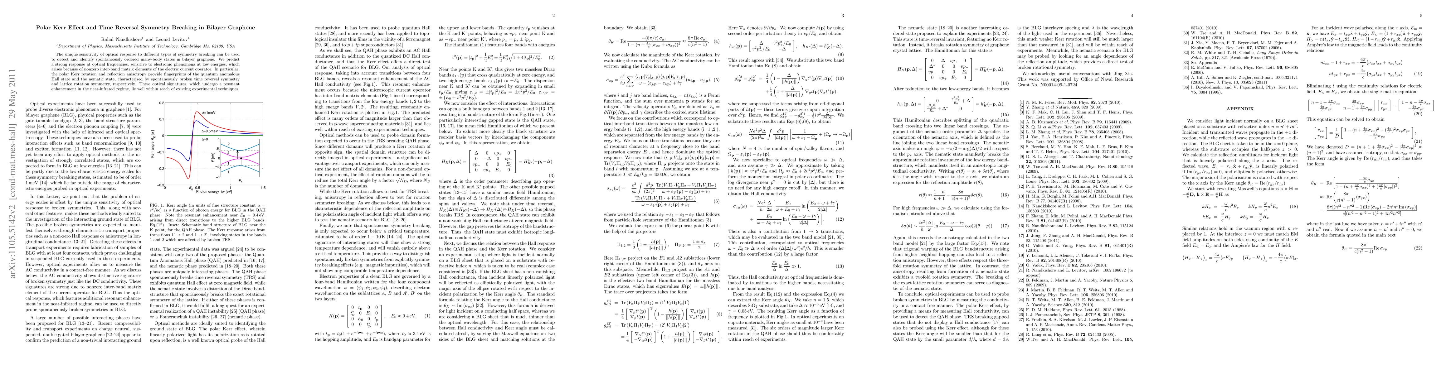 The paper predicts strong optical responses in bilayer graphene indicative of broken time reversal symmetry, using polar Kerr effect and reflection anisotropy to identify quantum anomalous Hall and nematic states. These effects are experimentally accessible with current technology.