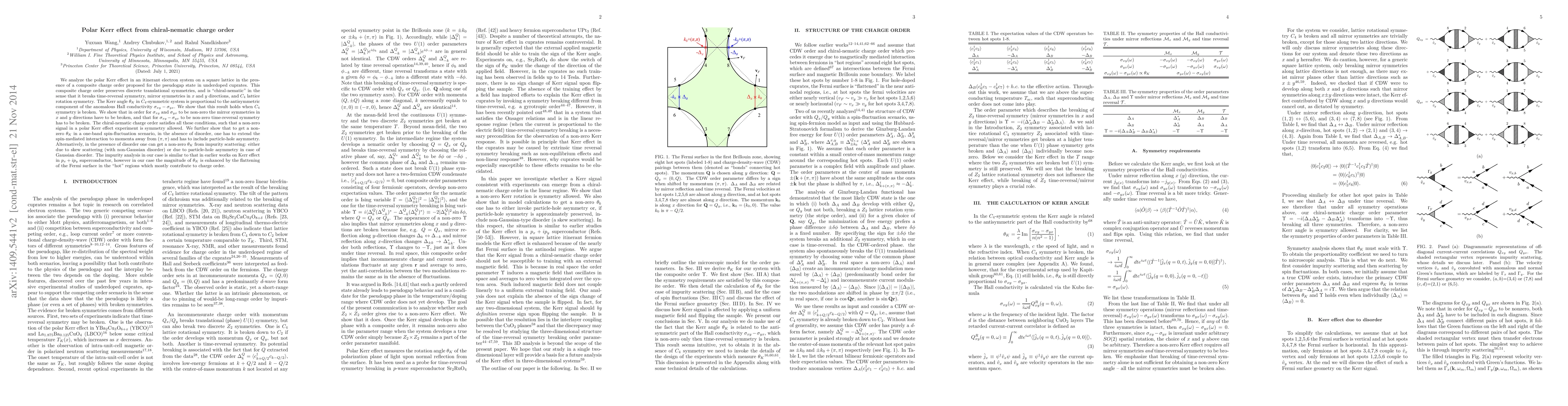 This paper investigates the polar Kerr effect in an itinerant electron system with a chiral-nematic charge order, showing that it is allowed due to broken symmetries. It also explores mechanisms for non-zero Kerr angle, including spin-fluctuation interactions and impurity scattering.