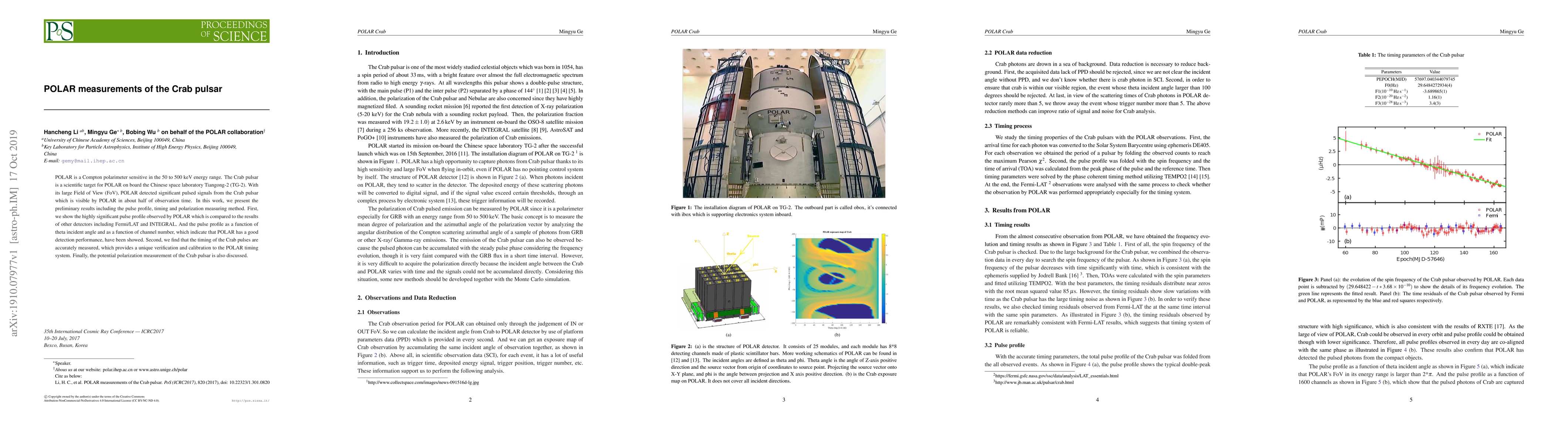 This paper reports preliminary results from POLAR, a Compton polarimeter on the Tiangong-2 space laboratory, detecting significant pulsed signals from the Crab pulsar in the 50 to 500 keV energy range. The study presents the highly significant pulse profile and timing accuracy of the Crab pulsar, providing a verification for POLAR's timing system and discussing potential polarization measurements.