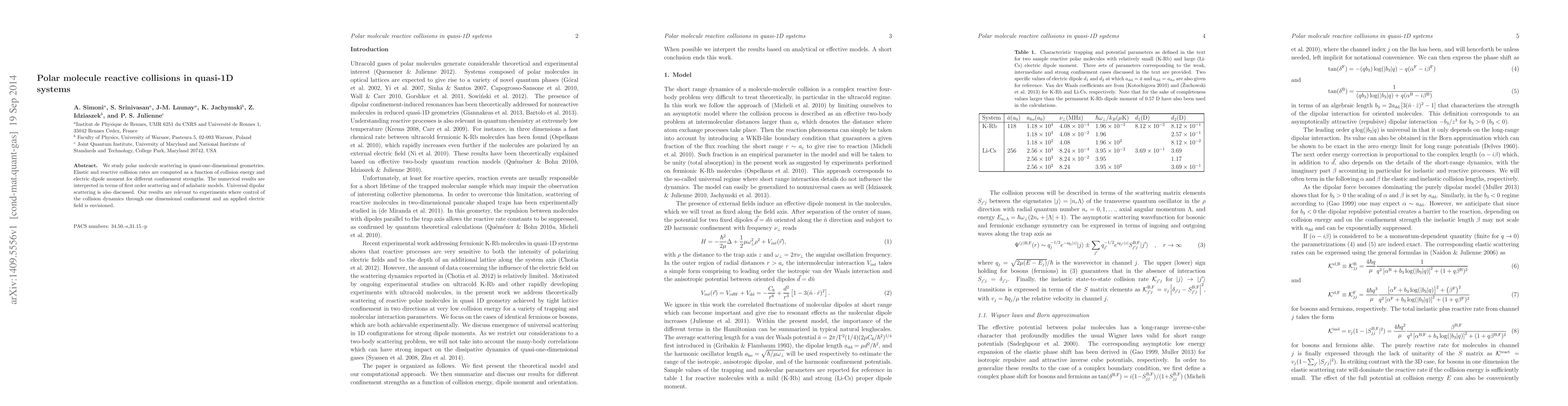We study polar molecule scattering in quasi-one-dimensional geometries. Elastic and reactive collision rates are computed as a function of collision energy and electric dipole moment for different confinement strengths. The numerical results are interpreted in terms of first order scattering and of adiabatic models. Universal dipolar scattering is also discussed. Our results are relevant to experiments where control of the collision dynamics through one dimensional confinement and an applied electric field is envisioned.