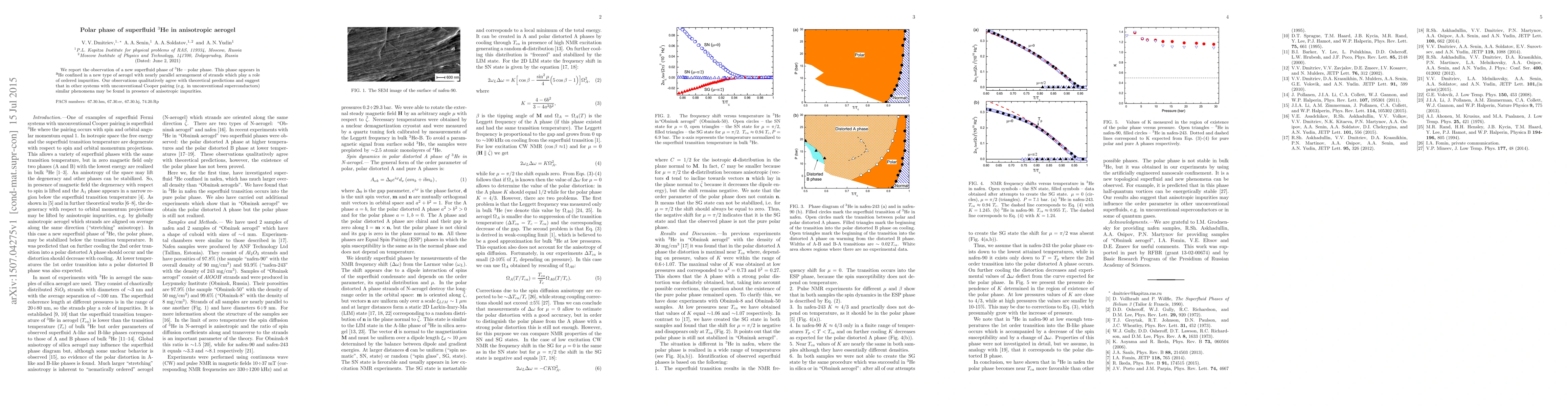 This paper reports the discovery of a novel polar phase of superfluid 3He within anisotropic aerogel, aligning with theoretical predictions and hinting at similar phenomena in unconventional superconductors with anisotropic impurities.
