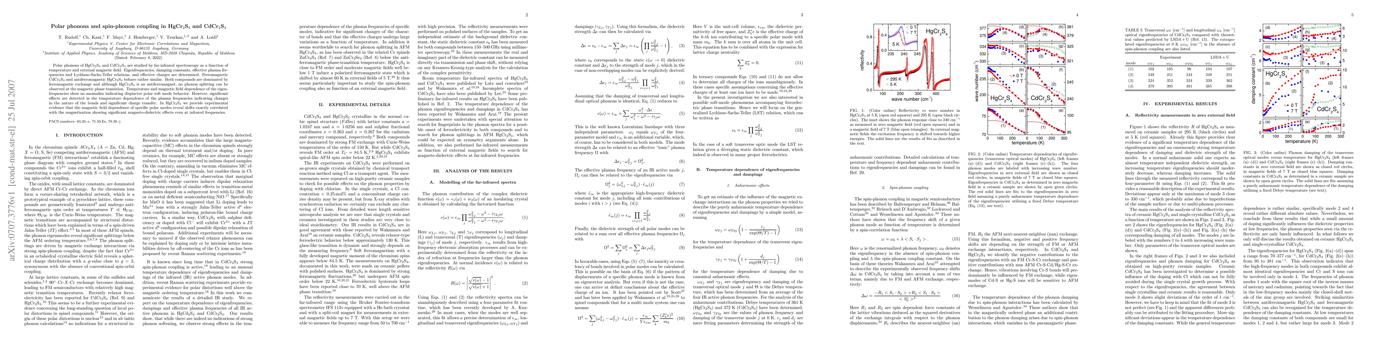 Polar phonons of HgCr2S4 and CdCr2S4 are studied by far-infrared spectroscopy as a function of temperature and external magnetic field. Eigenfrequencies, damping constants, effective plasma frequencies and Lyddane-Sachs-Teller relations, and effective charges are determined. Ferromagnetic CdCr2S4 and antiferromagnetic HgCr2S4 behave rather similar. Both compounds are dominated by ferromagnetic exchange and although HgCr2S4 is an antiferromagnet, no phonon splitting can be observed at the magnetic phase transition. Temperature and magnetic field dependence of the eigenfrequencies show no anomalies indicating displacive polar soft mode behavior. However, significant effects are detected in the temperature dependence of the plasma frequencies indicating changes in the nature of the bonds and significant charge transfer. In HgCr2S4 we provide experimental evidence that the magnetic field dependence of specific polar modes reveal shifts exactly correlated with the magnetization showing significant magneto-dielectric effects even at infrared frequencies.