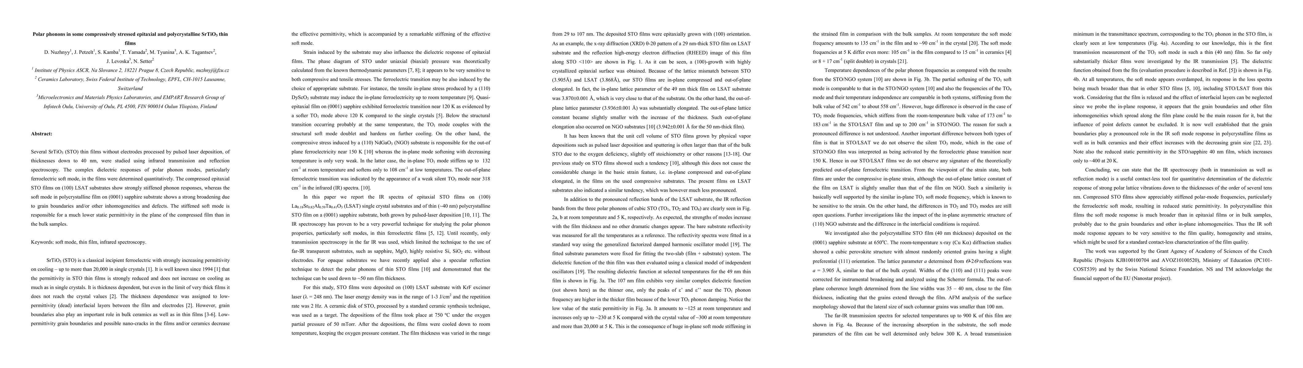 Researchers studied SrTiO3 thin films under compression using infrared spectroscopy, finding stiffened phonon responses in compressed epitaxial films and broadening due to defects in polycrystalline films.