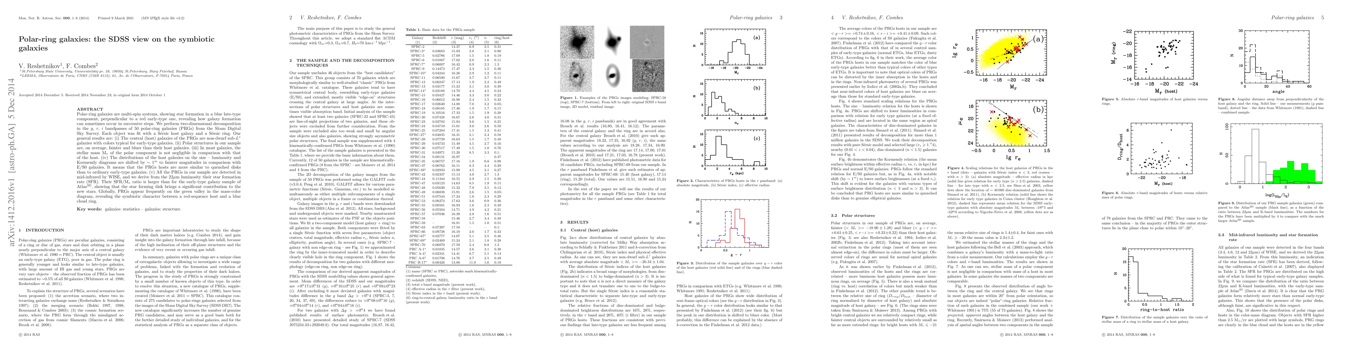Polar-ring galaxies are multi-spin systems, showing star formation in a blue late-type component, perpendicular to a red early-type one, revealing how galaxy formation can sometimes occur in successive steps. We perform two-dimensional decomposition in the $g$, $r$, $i$ bandpasses of 50 polar-ring galaxies (PRGs) from the Sloan Digital Sky Survey. Each object was fit with a S\'ersic host galaxy and a S\'ersic ring. Our general results are: (i) The central (host) galaxies of the PRGs are non-dwarf sub-$L^{\ast}$ galaxies with colors typical for early-type galaxies. (ii) Polar structures in our sample are, on average, fainter and bluer than their host galaxies. (iii) In most galaxies, the stellar mass M$_*$ of the polar component is not negligible in comparison with that of the host. (iv) The distributions of the host galaxies on the size -- luminosity and Kormendy diagrams are shifted by $\sim 1^m$ to fainter magnitudes in comparison with E/S0 galaxies. It means that the PRGs hosts are more similar to quenched disks than to ordinary early-type galaxies. (v) All the PRGs in our sample are detected in mid-infrared by WISE, and we derive from the 22$\mu$m luminosity their star formation rate (SFR). Their SFR/M$_*$ ratio is larger than for the early-type galaxy sample of Atlas$^{\rm 3D}$, showing that the star forming disk brings a significant contribution to the new stars. Globally, PRGs appear frequently on the green valley in the mass-color diagram, revealing the symbiotic character between a red-sequence host and a blue cloud ring.