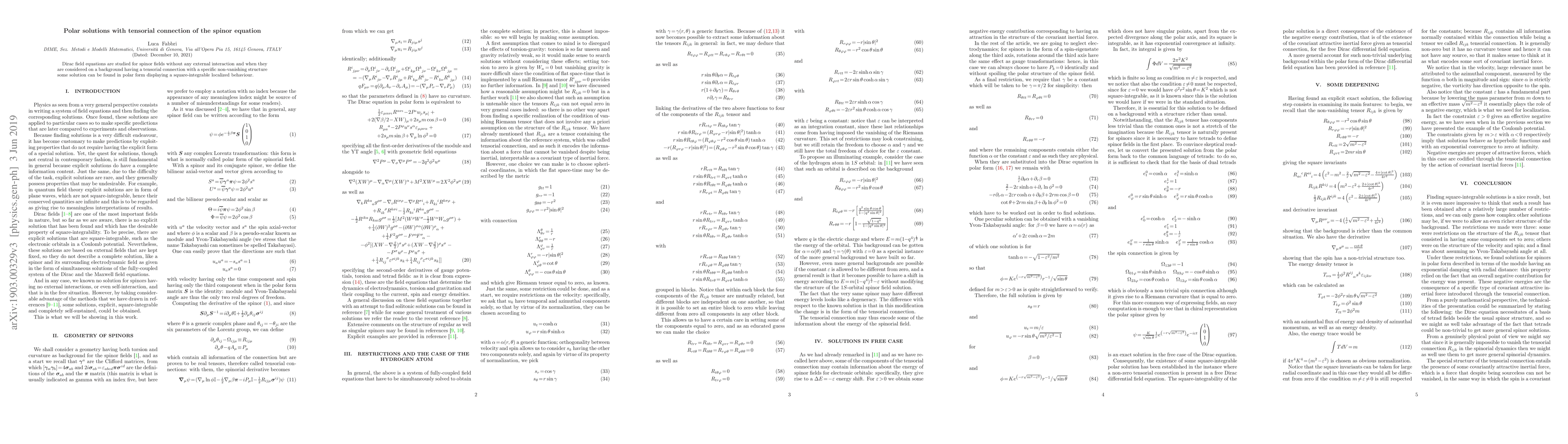 This research explores Dirac field equations for spinor fields, finding solutions in polar form that are square-integrable and localized, on a background with a non-vanishing tensorial connection, without external interaction.