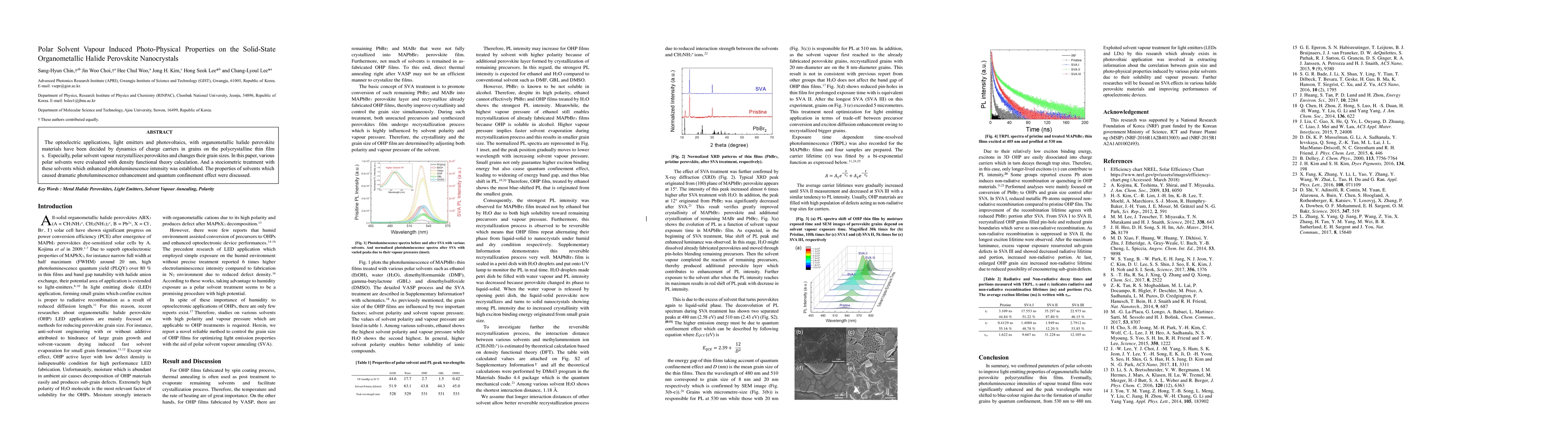 The optoelectric applications, light emitters and photovoltaics, with organometallic halide perovskite materials have been decided by dynamics of charge carriers in grains on the polycrystalline thin films. Especially, polar solvent vapour recrystallizes perovskites and changes their grain sizes. In this paper, various polar solvents were evaluated with density functional theory calculation. And a stociometric treatment with these solvents which enhanced photoluminescence intensity was established. The properties of solvents which caused dramatic photoluminescence enhancement and quantum confinement effect were discussed.