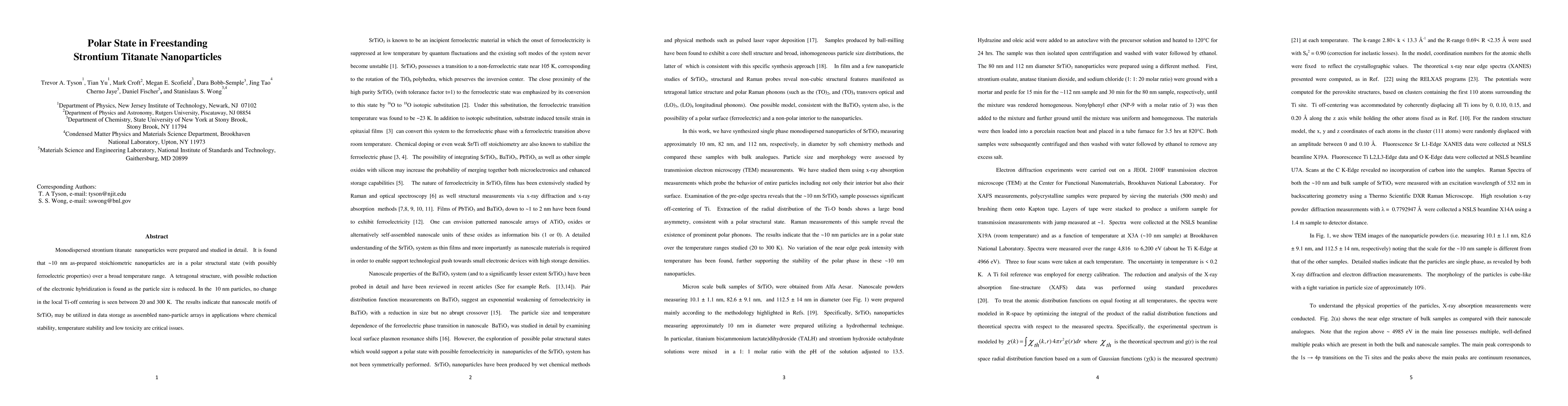 Monodispersed strontium titanate nanoparticles were prepared and studied in detail. It is found that ~10 nm as-prepared stoichiometric nanoparticles are in a polar structural state (with possibly ferroelectric properties) over a broad temperature range. A tetragonal structure, with possible reduction of the electronic hybridization is found as the particle size is reduced. In the 10 nm particles, no change in the local Ti-off centering is seen between 20 and 300 K. The results indicate that nanoscale motifs of SrTiO3 may be utilized in data storage as assembled nano-particle arrays in applications where chemical stability, temperature stability and low toxicity are critical issues.
