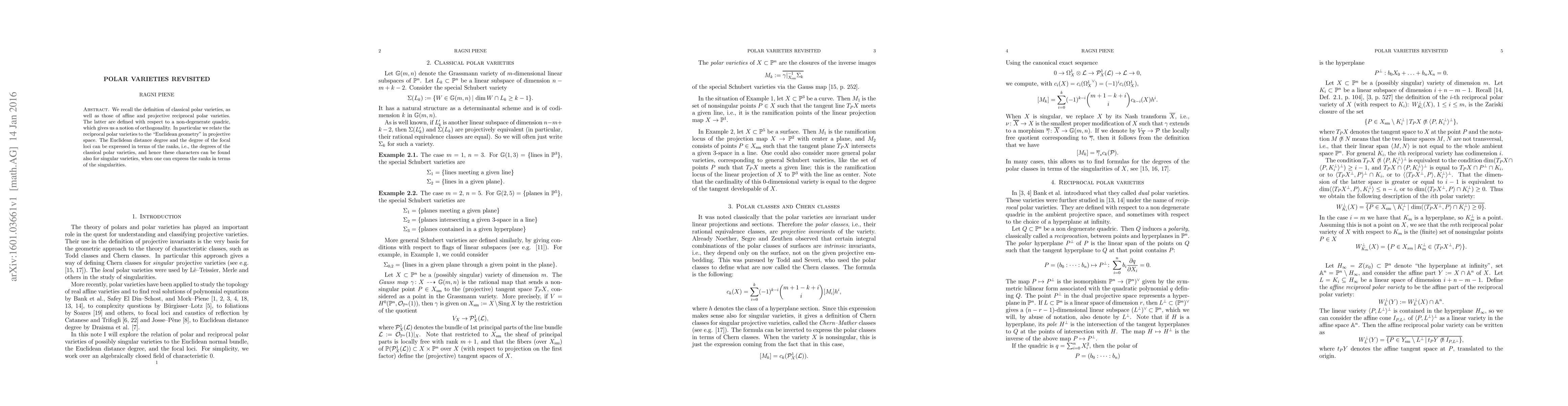 We recall the definition of classical polar varieties, as well as those of affine and projective reciprocal polar varieties. The latter are defined with respect to a non-degenerate quadric, which gives us a notion of orthogonality. In particular we relate the reciprocal polar varieties to the "Euclidean geometry" in projective space. The Euclidean distance degree and the degree of the focal loci can be expressed in terms of the ranks, i.e., the degrees of the classical polar varieties, and hence these characters can be found also for singular varieties, when one can express the ranks in terms of the singularities.