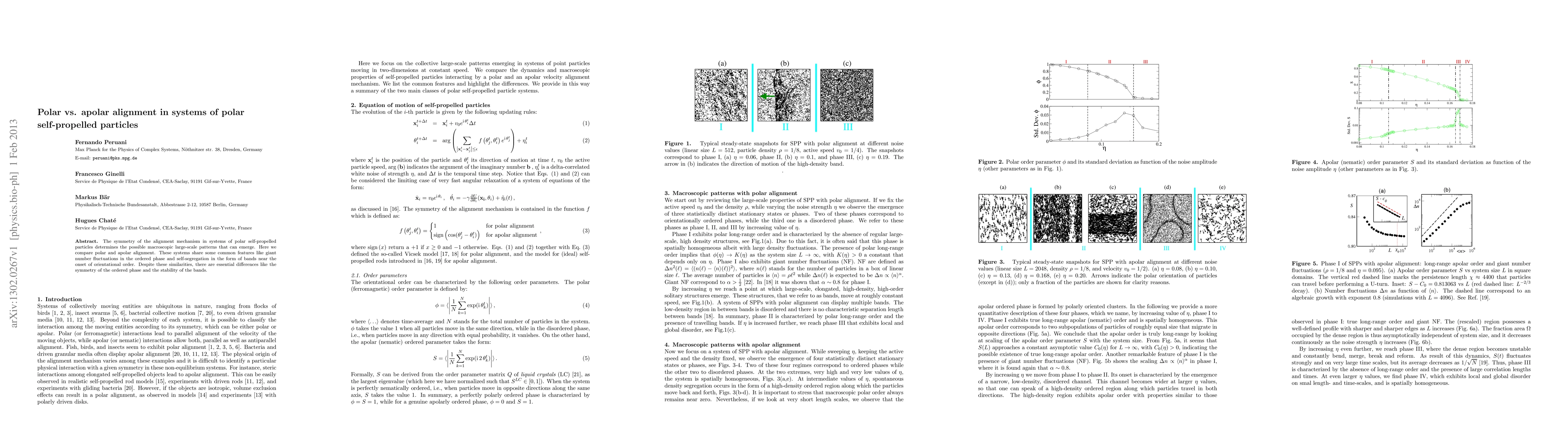 This paper compares polar and apolar alignment in systems of polar self-propelled particles, highlighting common features such as number fluctuations and self-segregation, while noting key differences in the symmetry and stability of the ordered phases.