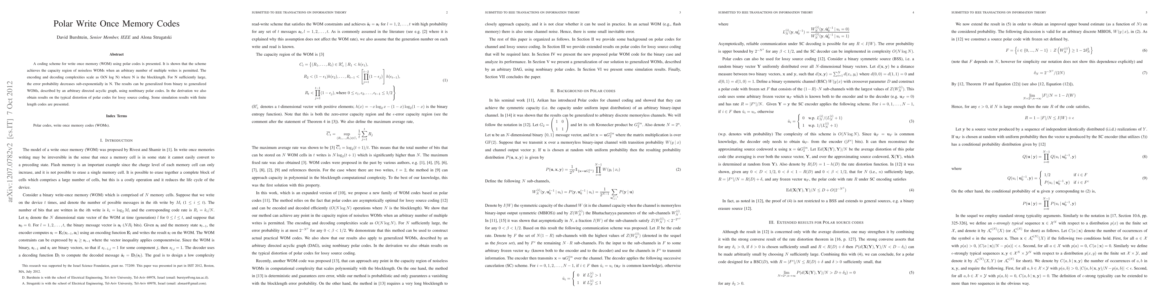 A coding scheme for write once memory (WOM) using polar codes is presented. It is shown that the scheme achieves the capacity region of noiseless WOMs when an arbitrary number of multiple writes is permitted. The encoding and decoding complexities scale as O(N log N) where N is the blocklength. For N sufficiently large, the error probability decreases sub-exponentially in N. The results can be generalized from binary to generalized WOMs, described by an arbitrary directed acyclic graph, using nonbinary polar codes. In the derivation we also obtain results on the typical distortion of polar codes for lossy source coding. Some simulation results with finite length codes are presented.
