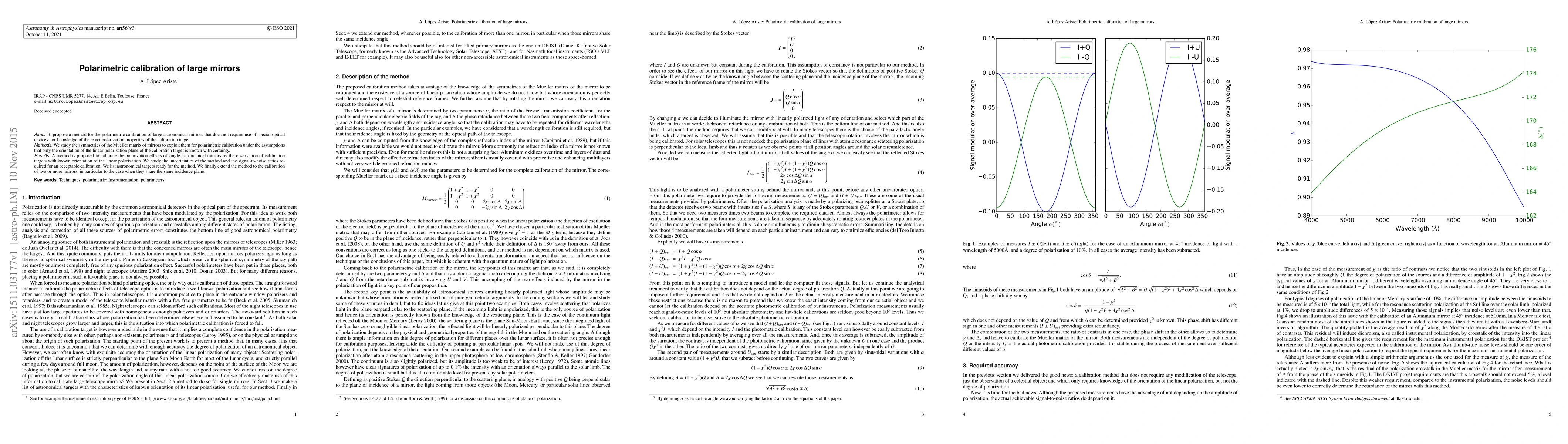 Aims: To propose a method for the polarimetric calibration of large astronomical mirrors that does not require use of special optical devices nor knowledge of the exact polarization properties of the calibration target. Methods: We study the symmetries of the Mueller matrix of mirrors to exploit them for polarimetric calibration under the assumptions that only the orientation of the linear polarization plane of the calibration target is known with certainty. Results: A method is proposed to calibrate the polarization effects of single astronomical mirrors by the observation of calibration targets with known orientation of the linear polarization. We study the uncertainties of the method and the signal-to-noise ratios required for an acceptable calibration. We list astronomical targets ready for the method. We finally extend the method to the calibration of two or more mirrors, in particular to the case when they share the same incidence plane.