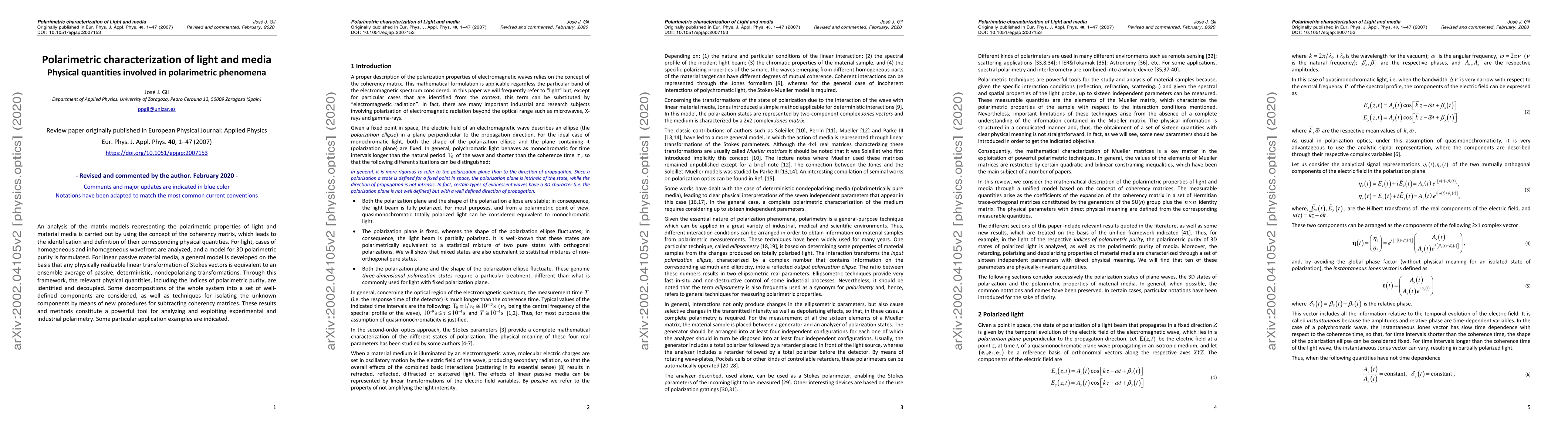 The paper presents a detailed mathematical framework for characterizing polarimetric properties of light and material media, introducing new methods for decomposing coherency matrices and analyzing polarimetric systems.