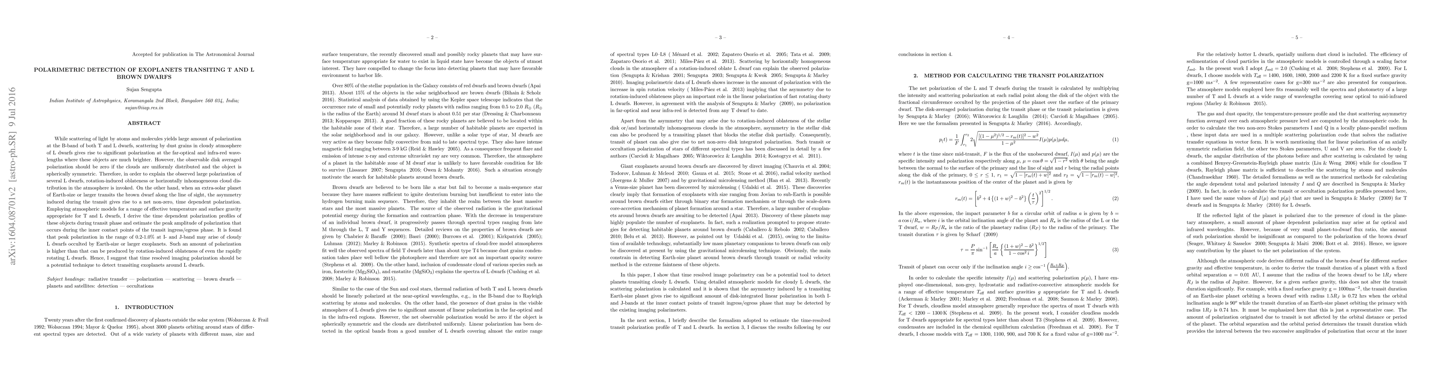 This paper explores the use of polarimetric detection to identify exoplanets transiting T- and L-brown dwarfs. It finds that scattering by dust in L-dwarfs' atmospheres can produce significant polarization, especially during transits by Earth-sized or larger exoplanets, potentially leading to detectable polarization peaks of 0.2-1.0% in the I- and J-bands, suggesting time-resolved imaging polarization as a viable detection method.