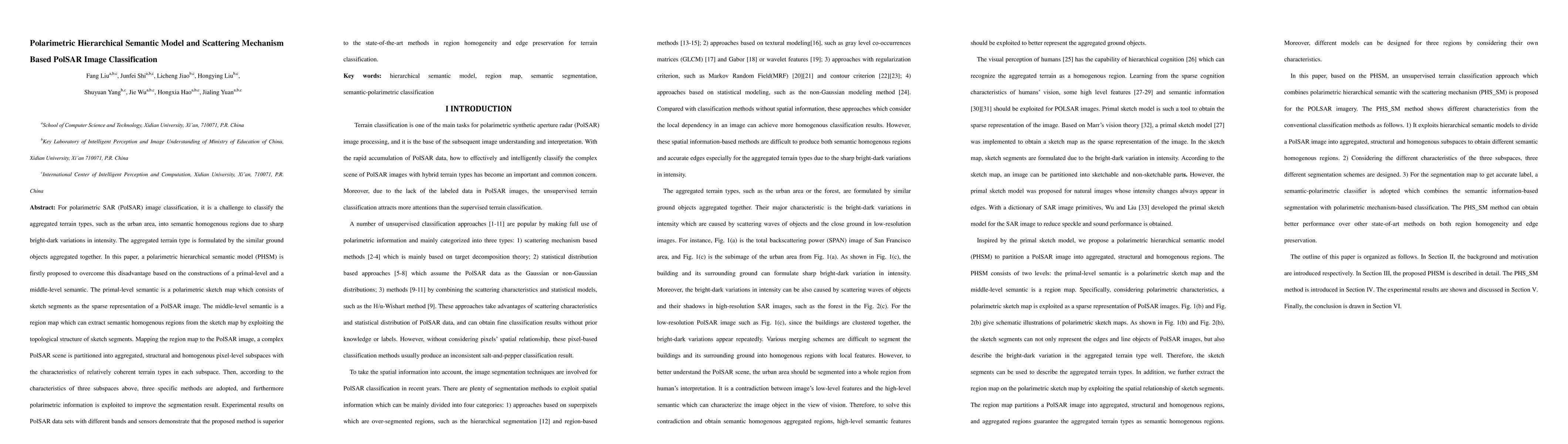 A polarimetric hierarchical semantic model (PHSM) is proposed for PolSAR image classification, comprising a primal-level semantic (polarimetric sketch map) and a middle-level semantic (region map). The model partitions a PolSAR image into aggregated, structural, and homogenous regions, with tailored methods for each.
