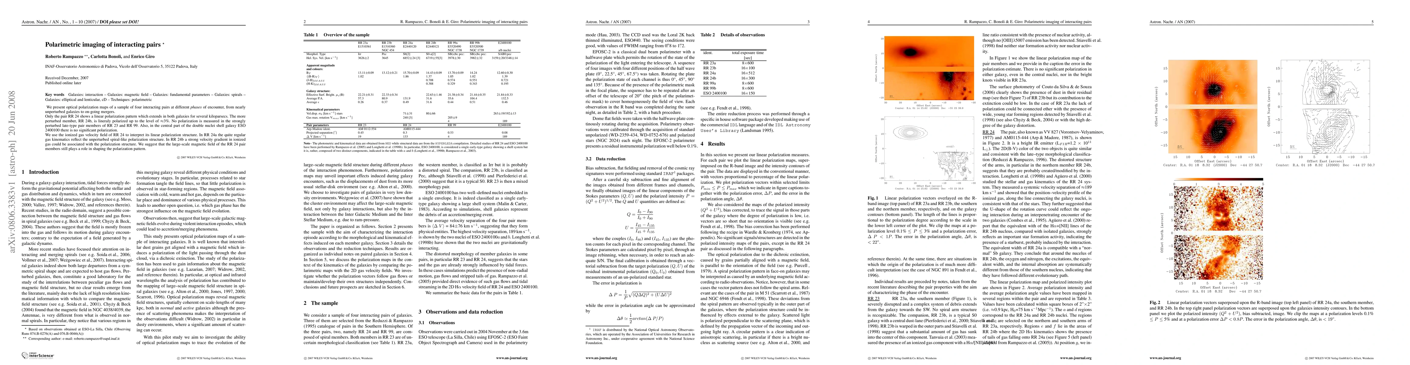We present optical polarization maps of a sample of four interacting pairs at different phases of encounter, from nearly unperturbed galaxies to on-going mergers. Only the pair RR 24 shows a linear polarization pattern which extends in both galaxies for several kiloparsecs. The more perturbed member, RR 24b, is lineraly polarized up to the level of ~3%. No polarization is measured in the strongly perturbed late-type pair members of RR 23 and RR 99. Also, in the central part of the double nuclei shell galaxy ESO 2400100 there is no significant polarization. We use the ionized gas velocity field of RR 24 to interpret its linear polarization structure. In RR 24a the quite regular gas kinematics reflect the unperturbed spiral-like polarization structure. In RR 24b a strong velocity gradient in ionized gas could be associated with the polarization structure. We suggest that the large-scale magnetic field of the RR 24 pair members still plays a role in shaping the polarization pattern.