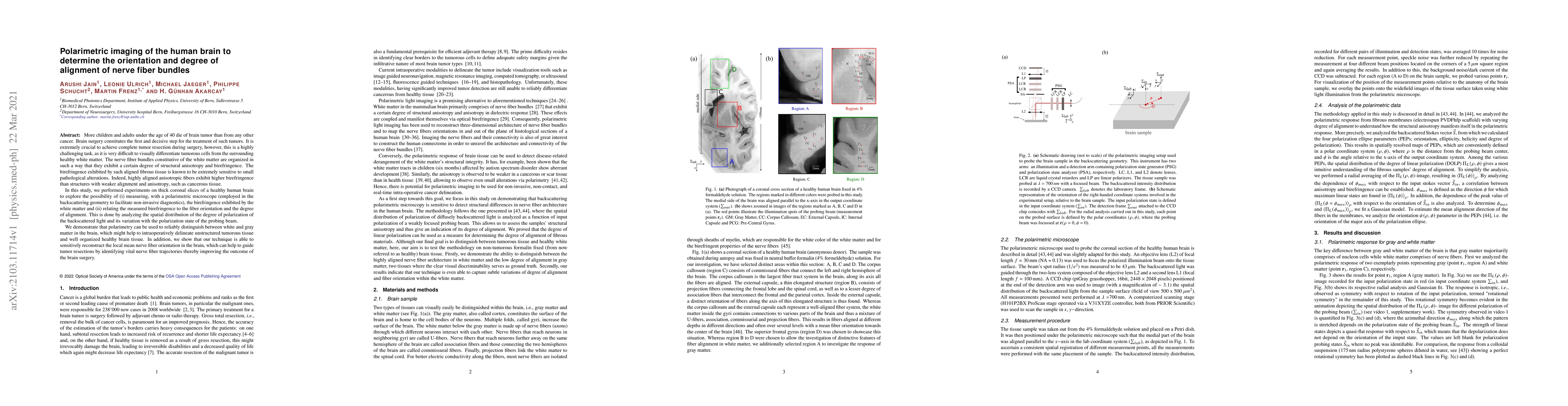More children and adults under the age of 40 die of brain tumor than from any other cancer. Brain surgery constitutes the first and decisive step for the treatment of such tumors. It is extremely crucial to achieve complete tumor resection during surgery, however, this is a highly challenging task, as it is very difficult to visually differentiate tumorous cells from the surrounding healthy white matter. The nerve fiber bundles constitutive of the white matter are organized in such a way that they exhibit a certain degree of structural anisotropy and birefringence. The birefringence exhibited by such aligned fibrous tissue is known to be extremely sensitive to small pathological alterations. Indeed, highly aligned anisotropic fibers exhibit higher birefringence than structures with weaker alignment and anisotropy, such as cancerous tissue. In this study, we performed experiments on thick coronal slices of a healthy human brain to explore the possibility of (i) measuring, with a polarimetric microscope (employed in the backscattering geometry to facilitate non-invasive diagnostics), the birefringence exhibited by the white matter and (ii) relating the measured birefringence to the fiber orientation and the degree of alignment. This is done by analyzing the spatial distribution of the degree of polarization of the backscattered light and its variation with the polarization state of the probing beam. We demonstrate that polarimetry can be used to reliably distinguish between white and gray matter in the brain, which might help to intraoperatively delineate unstructured tumorous tissue and well organized healthy brain tissue. In addition, we show that our technique is able to sensitively reconstruct the local mean nerve fiber orientation in the brain, which can help to guide tumor resections by identifying vital nerve fiber trajectories thereby improving the outcome of the brain surgery.