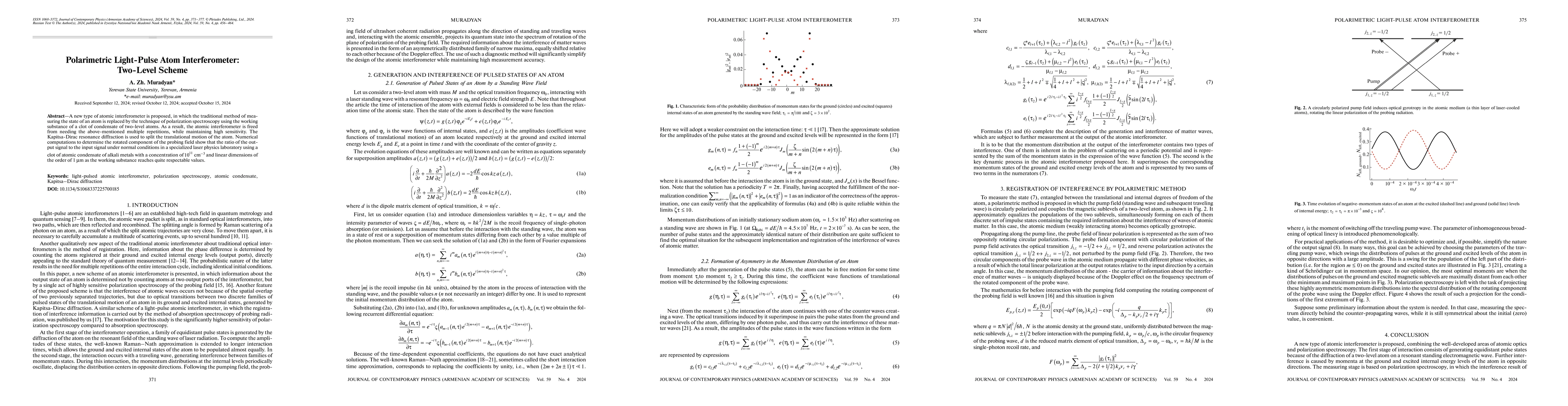 A new type of atomic interferometer is proposed, in which the traditional method of measuring the state of an atom is replaced by the technique of polarization spectroscopy using the working substance of a clot of condensate of two-level atoms. As a result, the atomic interferometer is freed from needing the above-mentioned multiple repetitions, while maintaining high sensitivity. The Kapitza-Dirac resonance diffraction is used to split the translational motion of the atom. Numerical computations to determine the rotated component of the probing field show that the ratio of the out-put signal to the input signal under normal conditions in a specialized laser physics laboratory using a clot of atomic condensate of alkali metals with a concentration of 10 in 11 power per cm cube and linear dimensions of the order of 1 micrometer as the working substance reaches quite respectable values.
