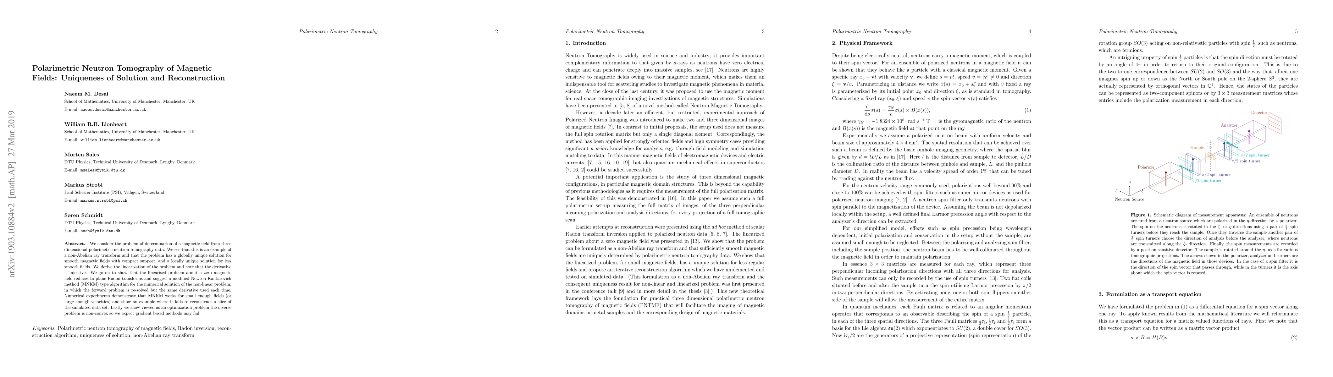 We consider the problem of determination of a magnetic field from three dimensional polarimetric neutron tomography data. We see that this is an example of a non-Abelian ray transform and that the problem has a globally unique solution for smooth magnetic fields with compact support, and a locally unique solution for less smooth fields. We derive the linearization of the problem and note that the derivative is injective. We go on to show that the linearised problem about a zero magnetic field reduces to plane Radon transforms and suggest a modified Newton Kantarovich method (MNKM) type algorithm for the numerical solution of the non-linear problem, in which the forward problem is re-solved but the same derivative used each time. Numerical experiments demonstrate that MNKM works for small enough fields (or large enough velocities) and show an example where it fails to reconstruct a slice of the simulated data set. Lastly we show viewed as an optimization problem the inverse problem is non-convex so we expect gradient based methods may fail.