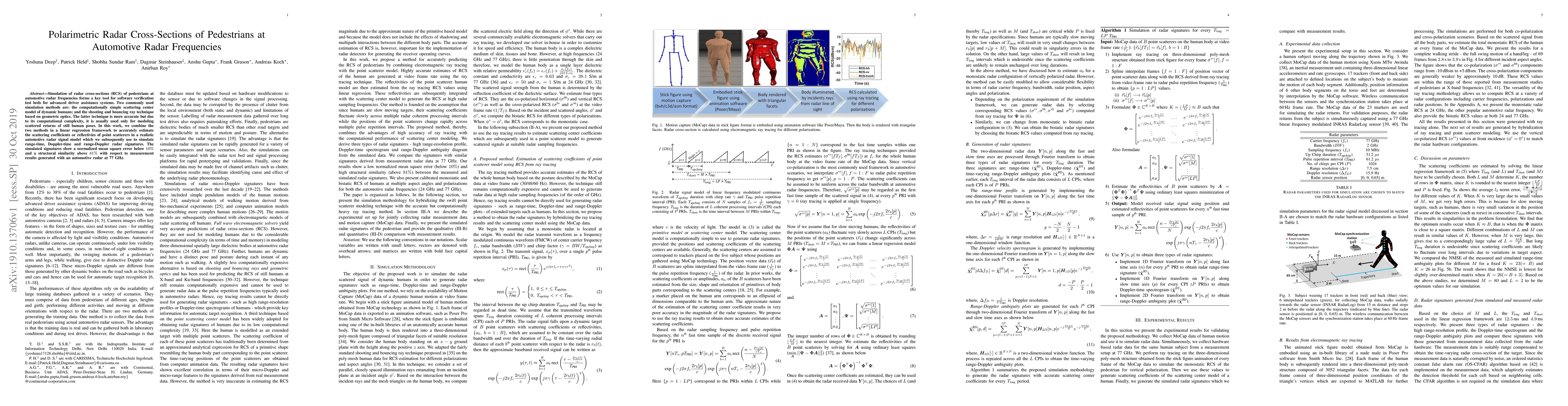 Simulation of radar cross-sections (RCS) of pedestrians at automotive radar frequencies forms a key tool for software verification test beds for advanced driver assistance systems. Two commonly used simulation methods are: the computationally simple scattering center model of dynamic humans; and the shooting and bouncing ray technique based on geometric optics. The latter technique is more accurate but due to its computational complexity, it is usually used only for modeling scattered returns of still human poses. In this work, we combine the two methods in a linear regression framework to accurately estimate the scattering coefficients or reflectivies of point scatterers in a realistic automotive radar signal model which we subsequently use to simulate range-time, Doppler-time and range-Doppler radar signatures. The simulated signatures show a normalized mean square error below 10% and a structural similarity above $81\%$ with respect to measurement results generated with an automotive radar at 77 GHz.