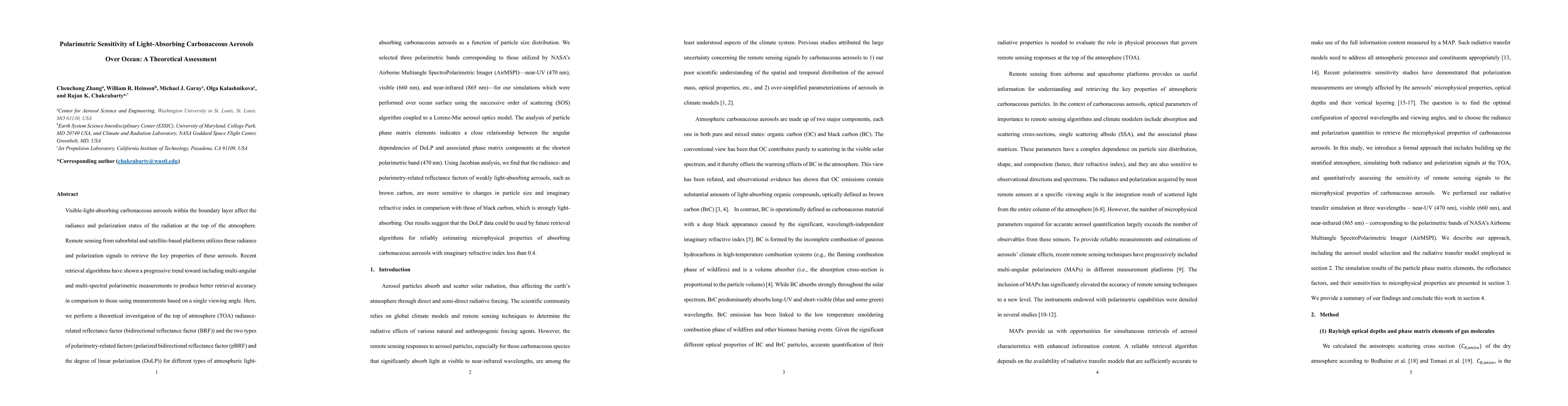 Visible-light-absorbing carbonaceous aerosols within the boundary layer affect the radiance and polarization states of the radiation at the top of the atmosphere. Remote sensing from suborbital and satellite-based platforms utilizes these radiance and polarization signals to retrieve the key properties of these aerosols. Recent retrieval algorithms have shown a progressive trend toward including multi-angular and multi-spectral polarimetric measurements to produce better retrieval accuracy in comparison to those using measurements based on a single viewing angle. Here, we perform a theoretical investigation of the top of atmosphere (TOA) radiance-related reflectance factor (bidirectional reflectance factor (BRF)) and the two types of polarimetry-related factors (polarized bidirectional reflectance factor (pBRF) and the degree of linear polarization (DoLP)) for different types of atmospheric light-absorbing carbonaceous aerosols as a function of particle size distribution. We selected three polarimetric bands corresponding to those utilized by NASA Airborne Multiangle SpectroPolarimetric Imager (AirMSPI) -- near-UV (470 nm), visible (660 nm), and near-infrared (865 nm) -- for our simulations which were performed over ocean surface using the successive order of scattering (SOS) algorithm coupled to a Lorenz-Mie aerosol optics model. The analysis of particle phase matrix elements indicates a close relationship between the angular dependencies of DoLP and associated phase matrix components at the shortest polarimetric band (470 nm). Using Jacobian analysis, we find that the radiance- and polarimetry-related reflectance factors of weakly light-absorbing aerosols, such as brown carbon, are more sensitive to changes in particle size and imaginary refractive index in comparison with those of black carbon, which is strongly light-absorbing.