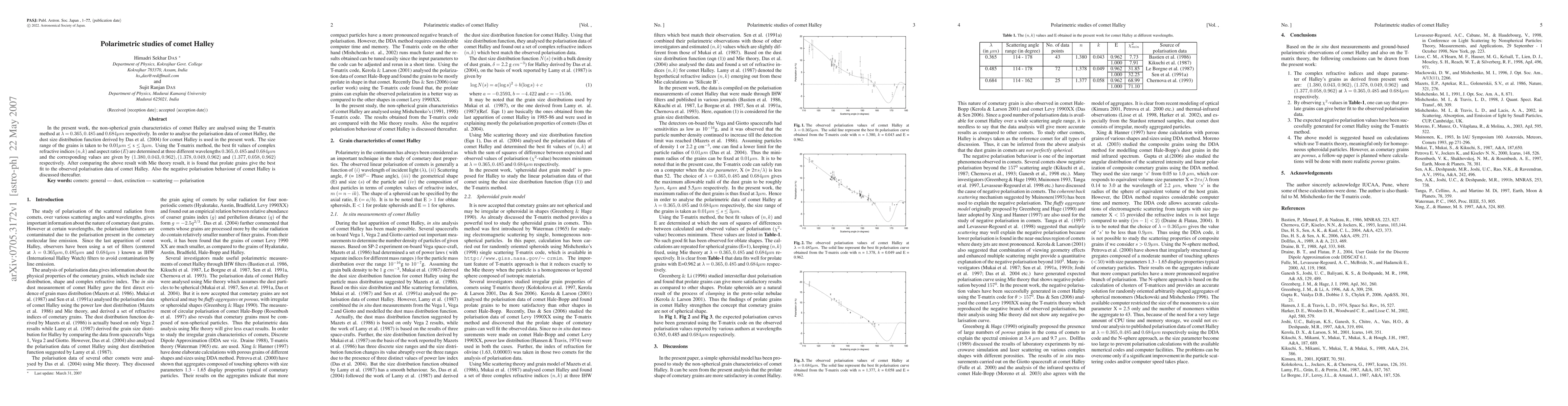 This study analyzed the polarimetric properties of Comet Halley using the T-matrix method, finding that prolate grains best fit the observed polarization data, with complex refractive indices varying across three different wavelengths.