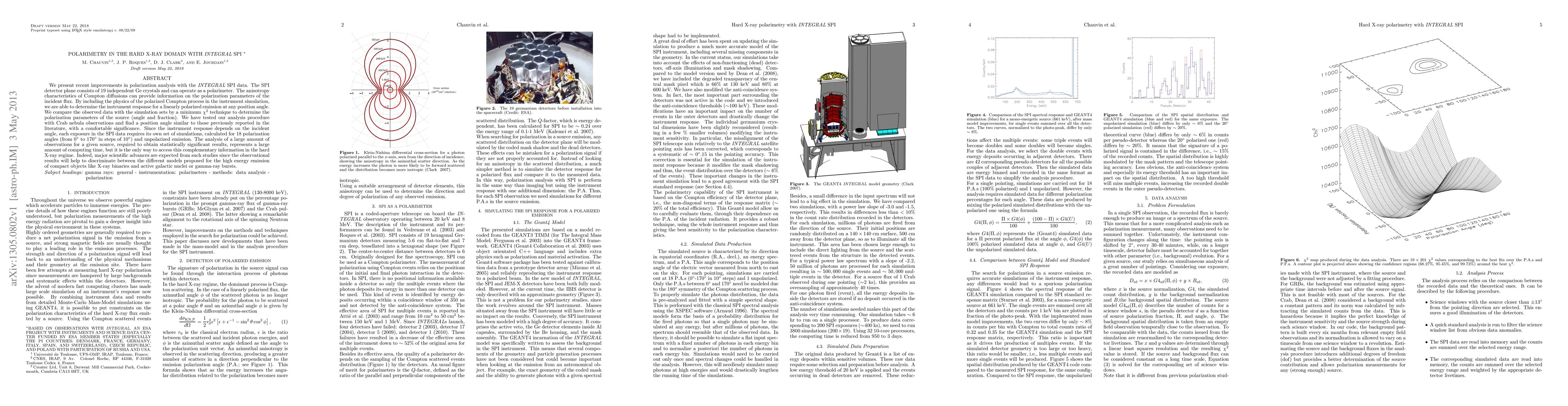 This paper details advancements in hard X-ray polarimetry using the INTEGRAL SPI instrument, which employs 19 independent Ge crystals to analyze polarization parameters. The study validates the analysis method using Crab nebula data and emphasizes the need for extensive simulations to determine polarization angles and fractions, highlighting the potential for significant scientific insights into high-energy astrophysical phenomena.