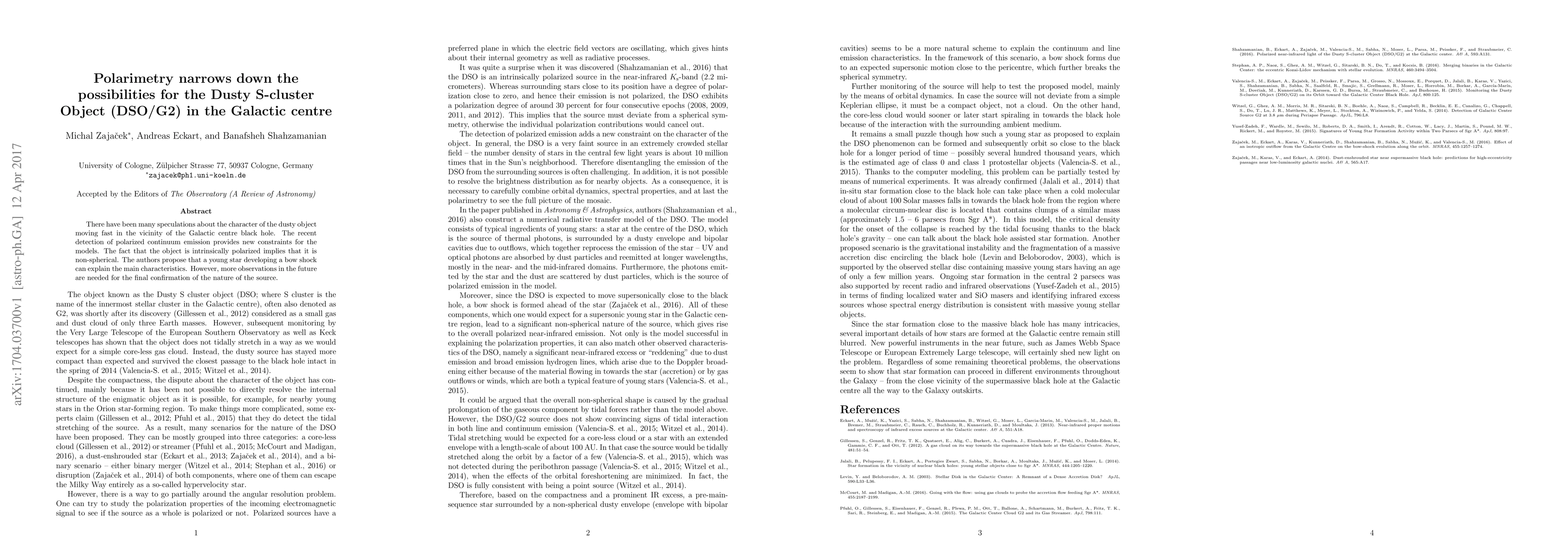 There have been many speculations about the character of the dusty object moving fast in the vicinity of the Galactic centre black hole. The recent detection of polarized continuum emission provides new constraints for the models. The fact that the object is intrinsically polarized implies that it is non-spherical. The authors propose that a young star developing a bow shock can explain the main characteristics. However, more observations in the future are needed for the final confirmation of the nature of the source.
