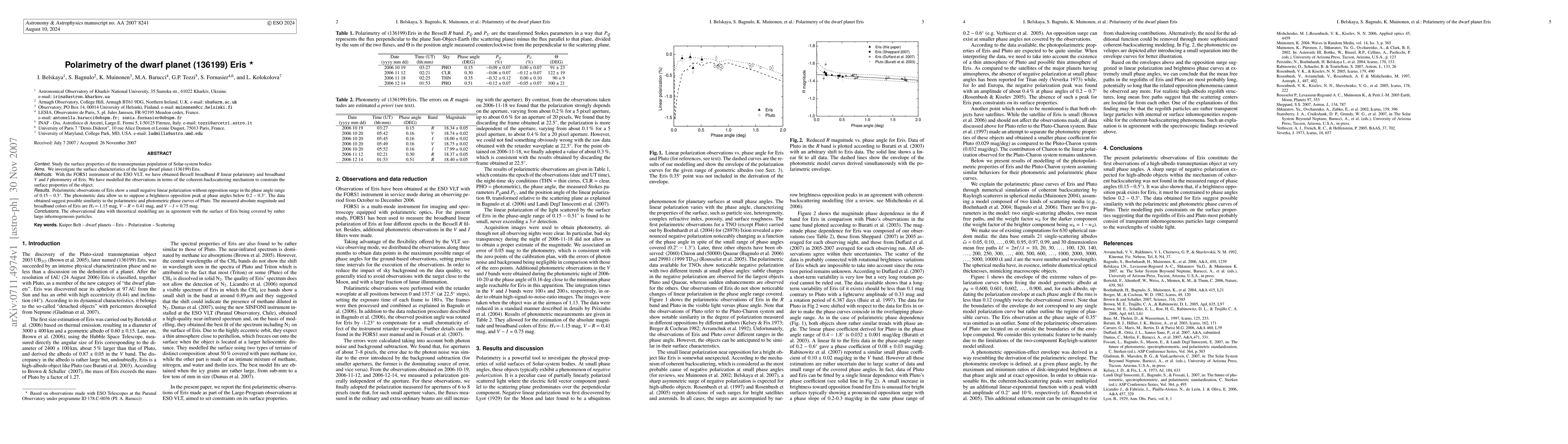 Researchers used polarimetry to study the surface of dwarf planet Eris, finding a small negative linear polarization with no opposition surge, similar to Pluto's phase curves, and measuring its absolute magnitude and colors.