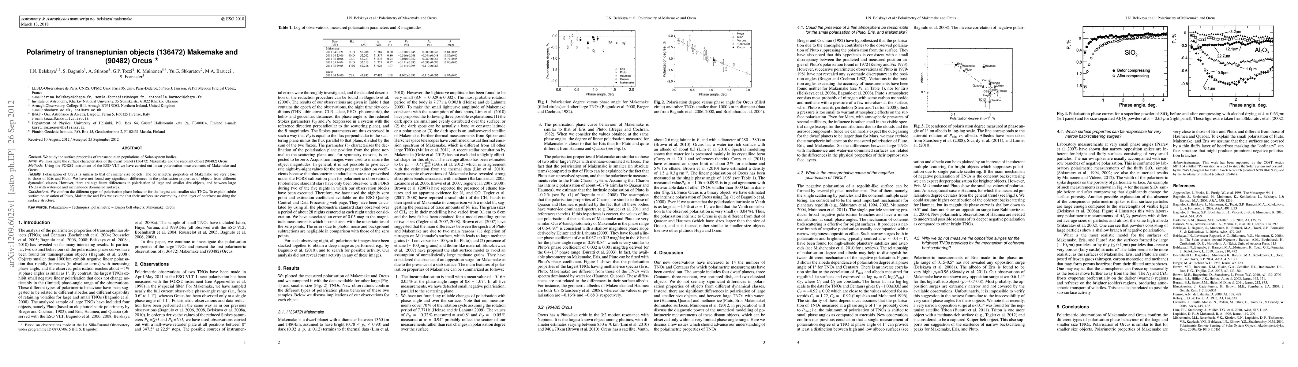Context. We study the surface properties of transneptunian populations of Solar-system bodies. Aims. We investigate the surface characteristics of the dwarf planet (136472) Makemake and the resonant object (90482) Orcus. Methods. Using the FORS2 instrument of the ESO-VLT we have carried out linear polarisation measurements of Makemake and Orcus. Results. Polarisation of Orcus is similar to that of smaller size objects. The polarimetric properties of Makemake are very close to those of Eris and Pluto. We have not found any significant differences in the polarisation properties of objects from different dynamical classes. However, there are significant differences in polarisation of large and smaller size objects, and between large TNOs with water-ice and methane-ice dominated surfaces. Conclusions. We confirm the different types of polarisation phase behavior for the largest and smaller size TNOs. To explain subtle surface polarisation of Pluto, Makemake and Eris we assume that their surfaces are covered by a thin layer of hoarfrost masking the surface structure.