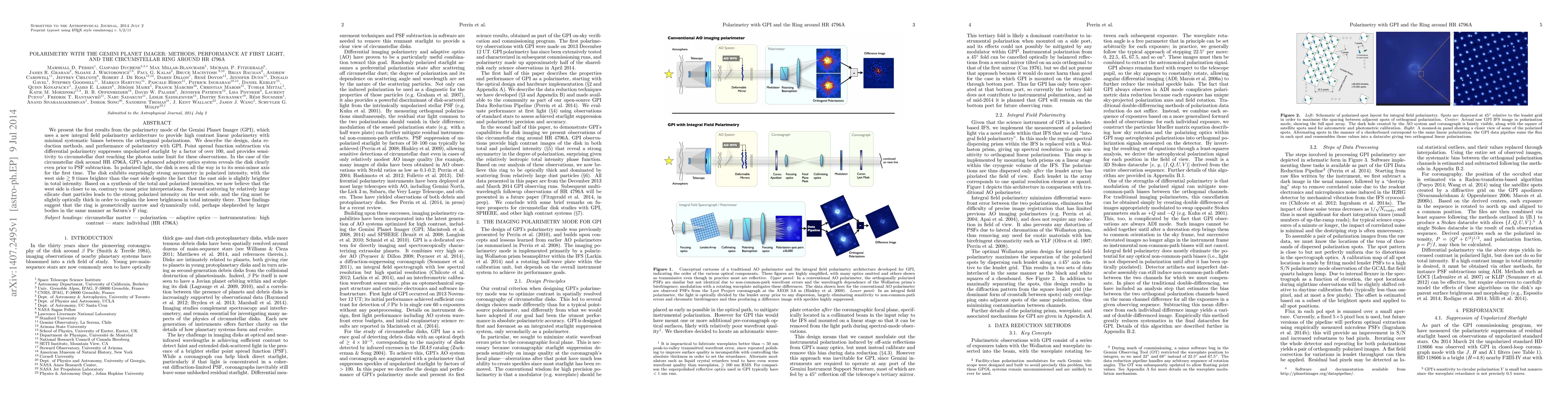 We present the first results from the polarimetry mode of the Gemini Planet Imager (GPI), which uses a new integral field polarimetry architecture to provide high contrast linear polarimetry with minimal systematic biases between the orthogonal polarizations. We describe the design, data reduction methods, and performance of polarimetry with GPI. Point spread function subtraction via differential polarimetry suppresses unpolarized starlight by a factor of over 100, and provides sensitivity to circumstellar dust reaching the photon noise limit for these observations. In the case of the circumstellar disk around HR 4796A, GPI's advanced adaptive optics system reveals the disk clearly even prior to PSF subtraction. In polarized light, the disk is seen all the way in to its semi-minor axis for the first time. The disk exhibits surprisingly strong asymmetry in polarized intensity, with the west side >9 times brighter than the east side despite the fact that the east side is slightly brighter in total intensity. Based on a synthesis of the total and polarized intensities, we now believe that the west side is closer to us, contrary to most prior interpretations. Forward scattering by relatively large silicate dust particles leads to the strong polarized intensity on the west side, and the ring must be slightly optically thick in order to explain the lower brightness in total intensity there. These findings suggest that the ring is geometrically narrow and dynamically cold, perhaps shepherded by larger bodies in the same manner as Saturn's F ring.