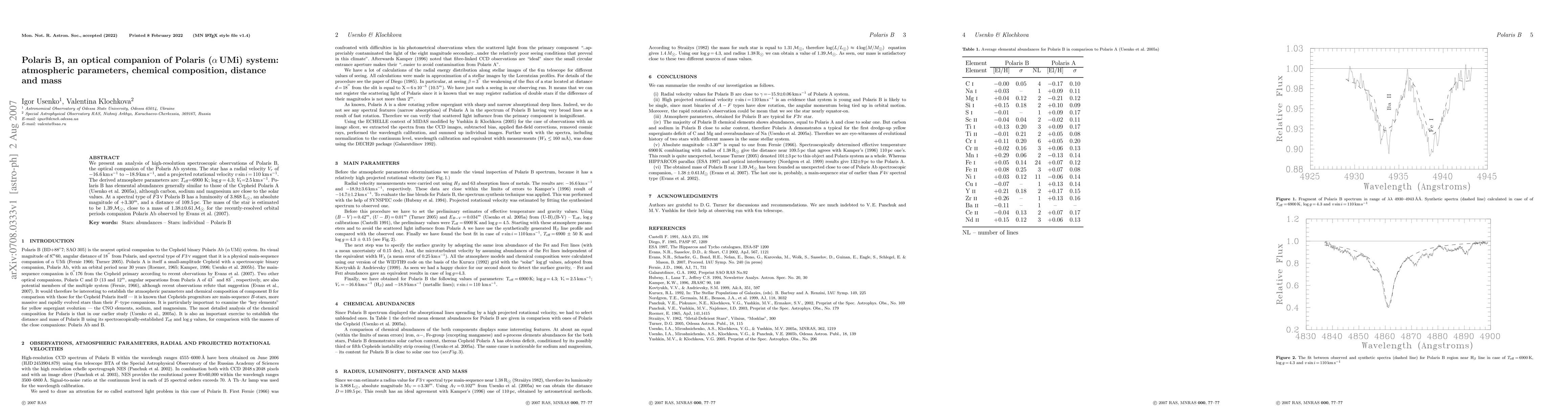 The study analyzes Polaris B, an optical companion of Polaris Ab system, revealing its atmospheric parameters, chemical composition, distance, mass, and luminosity, with implications for our understanding of binary star systems.