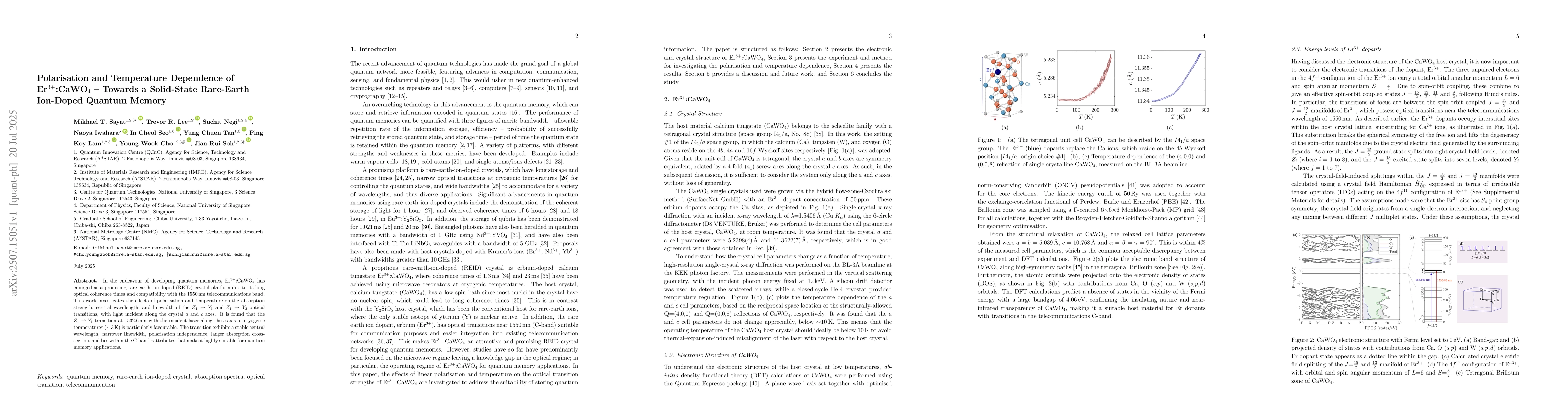In the endeavour of developing quantum memories, Er$^{3+}$:CaWO$_4$ has emerged as a promising rare-earth ion-doped (REID) crystal platform due to its long optical coherence times and compatibility with the 1550 nm telecommunications band. This work investigates the effects of polarisation and temperature on the absorption strength, central wavelength, and linewidth of the $Z_1\to Y_1$ and $Z_1\to Y_2$ optical transitions, with light incident along the crystal $a$ and $c$ axes. It is found that the $Z_1\to Y_1$ transition at 1532.6 nm with the incident laser along the $c$-axis at cryogenic temperatures ($\sim$3 K) is particularly favourable. The transition exhibits a stable central wavelength, narrower linewidth, polarisation independence, larger absorption cross-section, and lies within the C-band -- attributes that make it highly suitable for quantum memory applications.