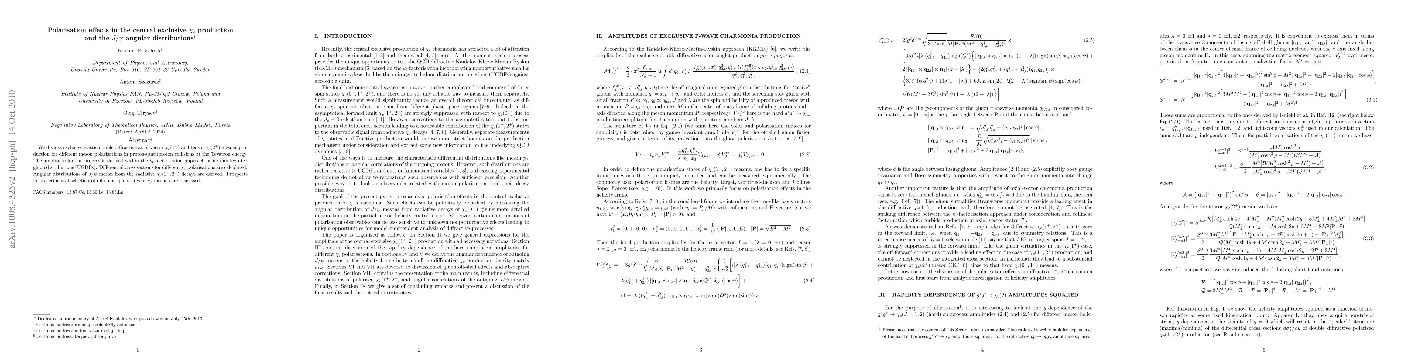 We discuss exclusive elastic double diffractive axial-vector $\chi_c(1^+)$ and tensor $\chi_c(2^+)$ mesons production for different meson polarisations in proton-(anti)proton collisions at the Tevatron energy. The amplitude for the process is derived within the $k_t$-factorisation approach using unintegrated gluon distributions (UGDFs). Differential cross sections for different $\chi_c$ polarisations are calculated. Angular distributions of $J/\psi$ meson from the radiative $\chi_c(1^+,2^+)$ decays are derived. Prospects for experimental selection of different spin states of $\chi_c$ mesons are discussed.