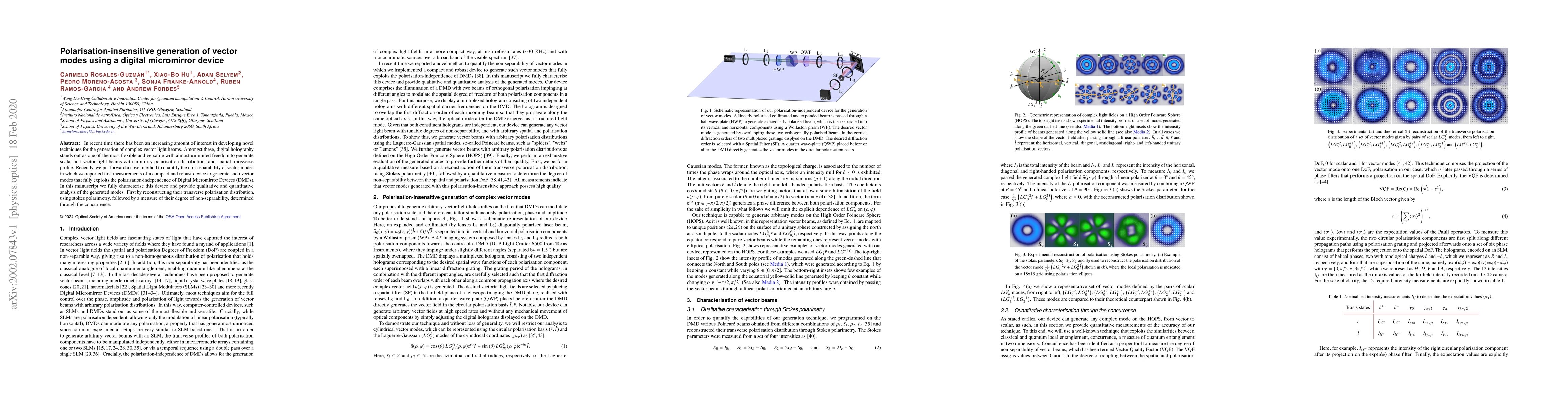 The research utilizes a Digital Micromirror Device (DMD) to generate complex vector light beams, exploiting its polarisation-independence. Two orthogonally polarised beams are overlapped in specific diffraction orders of multiplexed gratings displayed on the DMD, followed by selection of the desired diffraction order with a spatial filter. A quarter-wave plate is used before or after the DMD to directly generate vector modes in the circular polarisation basis.