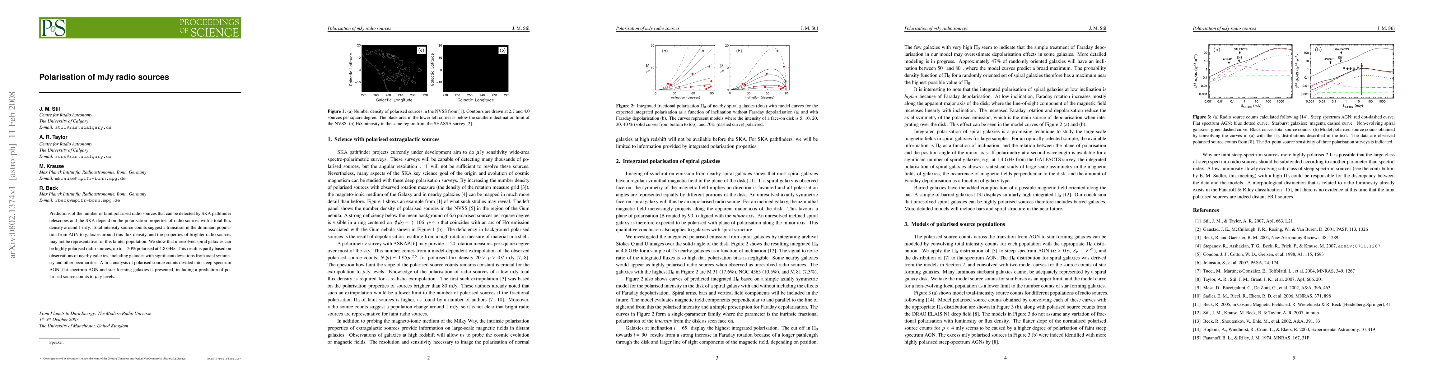 Predictions of the number of faint polarised radio sources that can be detected by SKA pathfinder telescopes and the SKA depend on the polarisation properties of radio sources with a total flux density around 1 mJy. Total intensity source counts suggest a transition in the dominant population from AGN to galaxies around this flux density, and the properties of brighter radio sources may not be representative for this fainter population. We show that unresolved spiral galaxies can be highly polarised radio sources, up to ~ 20% polarised at 4.8 GHz. This result is partly based on observations of nearby galaxies, including galaxies with significant deviations from axial symmetry and other peculiarities. A first analysis of polarised source counts divided into steep-spectrum AGN, flat-spectrum AGN and star forming galaxies is presented, including a prediction of polarised source counts to microjansky levels.