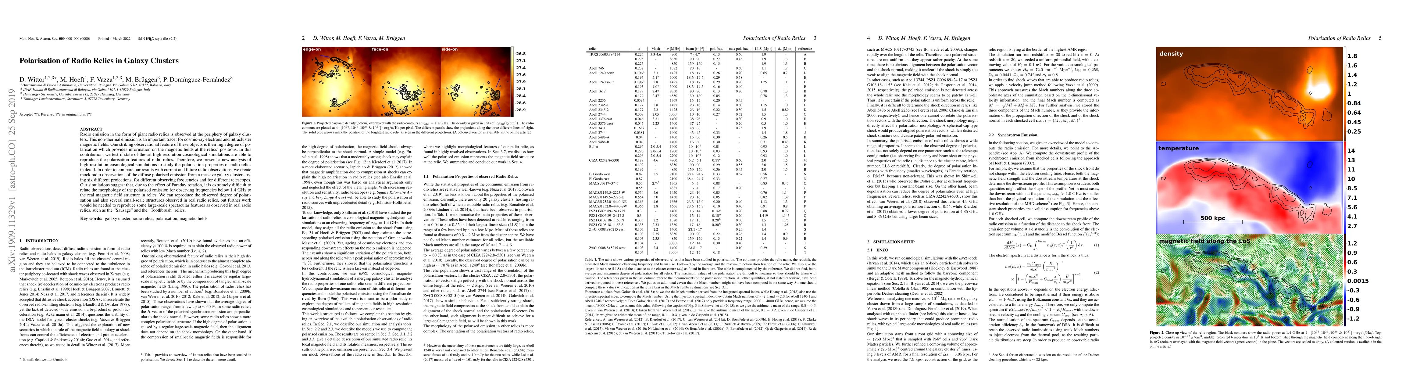 Radio emission in the form of giant radio relics is observed at the periphery of galaxy clusters. This non-thermal emission is an important tracer for cosmic-ray electrons and intracluster magnetic fields. One striking observational feature of these objects is their high degree of polarisation which provides information on the magnetic fields at the relics' positions. In this contribution, we test if state-of-the-art high resolution cosmological simulations are able to reproduce the polarisation features of radio relics. Therefore, we present a new analysis of high-resolution cosmological simulations to study the polarisation properties of radio relics in detail. In order to compare our results with current and future radio observations, we create mock radio observations of the diffuse polarised emission from a massive galaxy clusters using six different projections, for different observing frequencies and for different telescopes. Our simulations suggest that, due to the effect of Faraday rotation, it is extremely difficult to relate the morphology of the polarised emission for observing frequencies below $1.4 \ \mathrm{GHz}$ to the real magnetic field structure in relics. We can reproduce the observed degree of polarisation and also several small-scale structures observed in real radio relics, but further work would be needed to reproduce some large-scale spectacular features as observed in real radio relics, such as the "Sausage" and the "Toothbrush" relics.