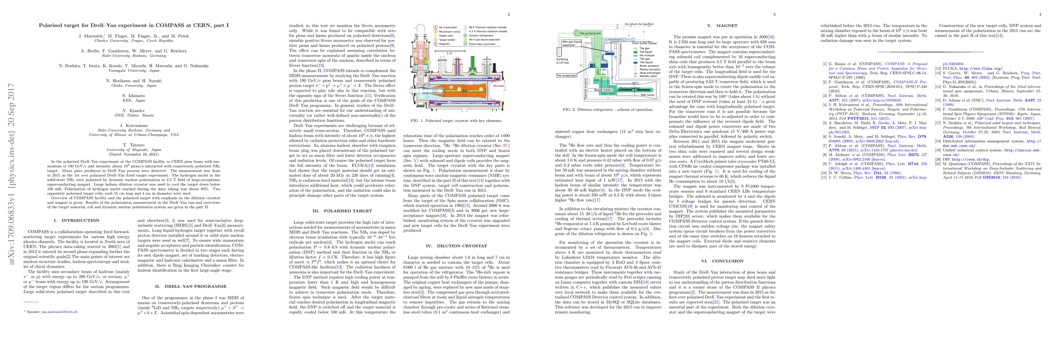 In the polarised Drell-Yan experiment at the COMPASS facility in CERN pion beam with momentum of 190 GeV/c and intensity about $10^8$ pions/s interacted with transversely polarised NH$_3$ target. Muon pairs produced in Drel-Yan process were detected. The measurement was done in 2015 as the 1st ever polarised Drell-Yan fixed target experiment. The hydrogen nuclei in the solid-state NH$_3$ were polarised by dynamic nuclear polarisation in 2.5 T field of large-acceptance superconducting magnet. Large helium dilution cryostat was used to cool the target down below 100 mK. Polarisation of hydrogen nuclei reached during the data taking was about 80 %. Two oppositely polarised target cells, each 55 cm long and 4 cm in diameter were used. Overview of COMPASS facility and the polarised target with emphasis on the dilution cryostat and magnet is given. Results of the polarisation measurement in the Drell-Yan run and overviews of the target material, cell and dynamic nuclear polarisation system are given in the part II.