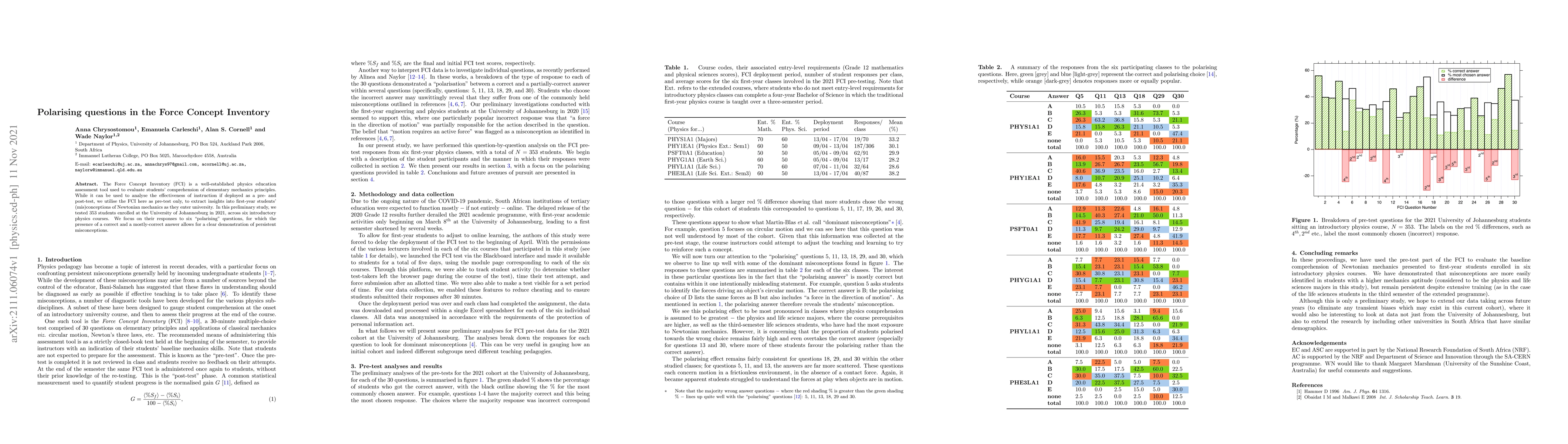 The Force Concept Inventory (FCI) is a well-established physics education assessment tool used to evaluate students' comprehension of elementary mechanics principles. While it can be used to analyse the effectiveness of instruction if deployed as a pre- and post-test, we utilise the FCI here as pre-test only, to extract insights into first-year students' (mis)conceptions of Newtonian mechanics as they enter university. In this preliminary study, we tested 353 students enrolled at the University of Johannesburg in 2021, across six introductory physics courses. We focus on their responses to six "polarising" questions, for which the presence of a correct and a mostly-correct answer allows for a clear demonstration of persistent misconceptions.