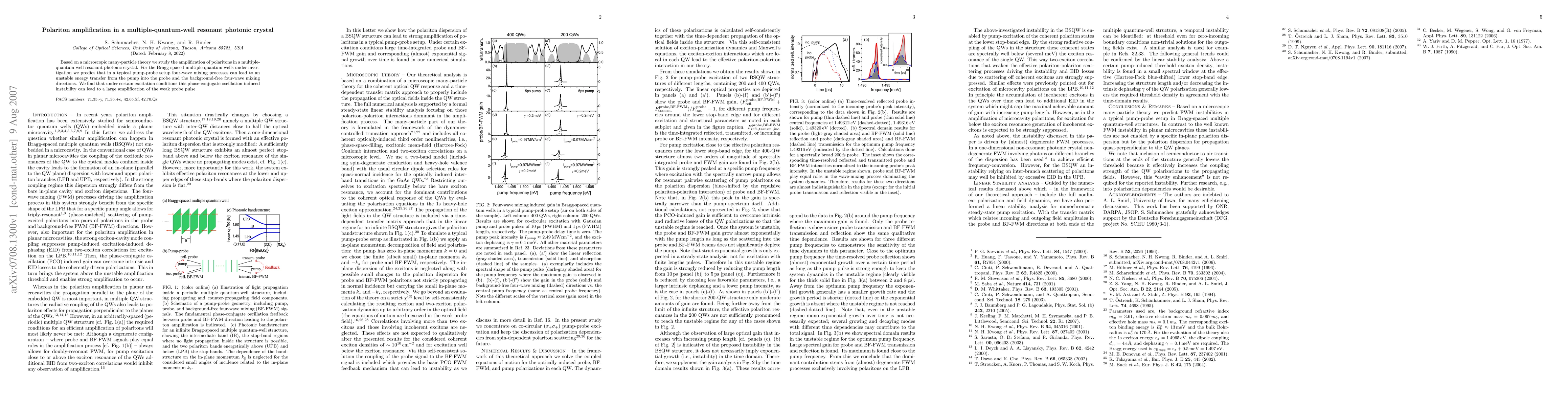 This research explores the amplification of polaritons in a multiple-quantum-well resonant photonic crystal using a microscopic many-particle theory. It predicts that four-wave mixing processes can cause an unstable energy transfer, leading to significant amplification of a weak probe pulse under specific excitation conditions.