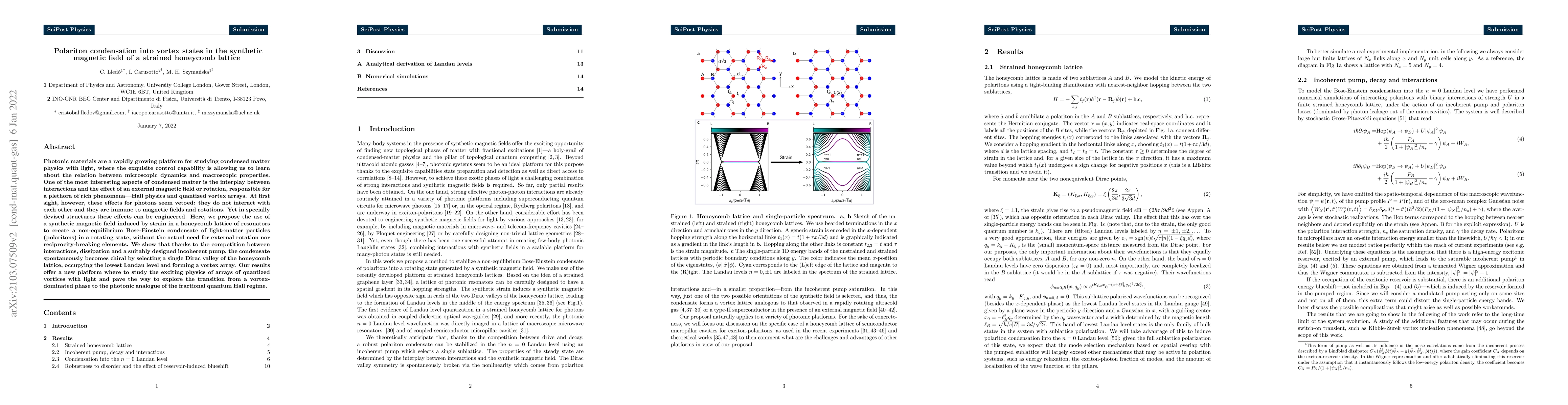 Photonic materials are a rapidly growing platform for studying condensed matter physics with light, where the exquisite control capability is allowing us to learn about the relation between microscopic dynamics and macroscopic properties. One of the most interesting aspects of condensed matter is the interplay between interactions and the effect of an external magnetic field or rotation, responsible for a plethora of rich phenomena -- Hall physics and quantized vortex arrays. At first sight, however, these effects for photons seem vetoed: they do not interact with each other and they are immune to magnetic fields and rotations. Yet in specially devised structures these effects can be engineered. Here, we propose the use of a synthetic magnetic field induced by strain in a honeycomb lattice of resonators to create a non-equilibrium Bose-Einstein condensate of light-matter particles (polaritons) in a rotating state, without the actual need for external rotation nor reciprocity-breaking elements. We show that thanks to the competition between interactions, dissipation and a suitably designed incoherent pump, the condensate spontaneously becomes chiral by selecting a single Dirac valley of the honeycomb lattice, occupying the lowest Landau level and forming a vortex array. Our results offer a new platform where to study the exciting physics of arrays of quantized vortices with light and pave the way to explore the transition from a vortex-dominated phase to the photonic analogue of the fractional quantum Hall regime.