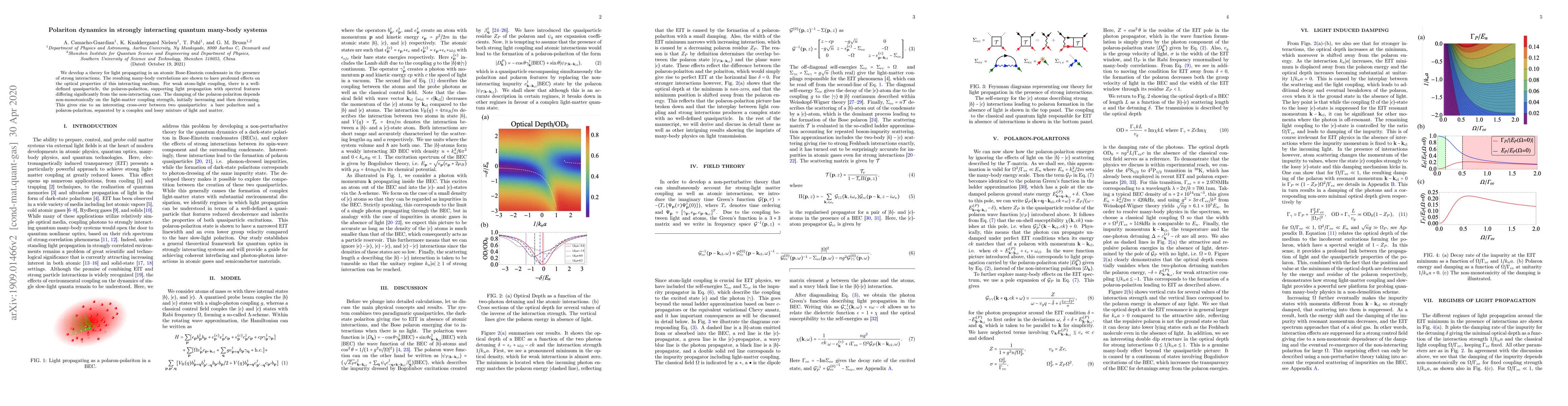 We develop a theory for light propagating in an atomic Bose-Einstein condensate in the presence of strong interactions. The resulting many-body correlations are shown to have profound effects on the optical properties of this interacting medium. For weak atom-light coupling, there is a well-defined quasiparticle, the polaron-polariton, supporting light propagation with spectral features differing significantly from the noninteracting case. The damping of the polaron-polariton depends nonmonotonically on the light-matter coupling strength, initially increasing and then decreasing. This gives rise to an interesting crossover between two quasiparticles: a bare polariton and a polaron-polariton, separated by a complex and lossy mixture of light and matter.